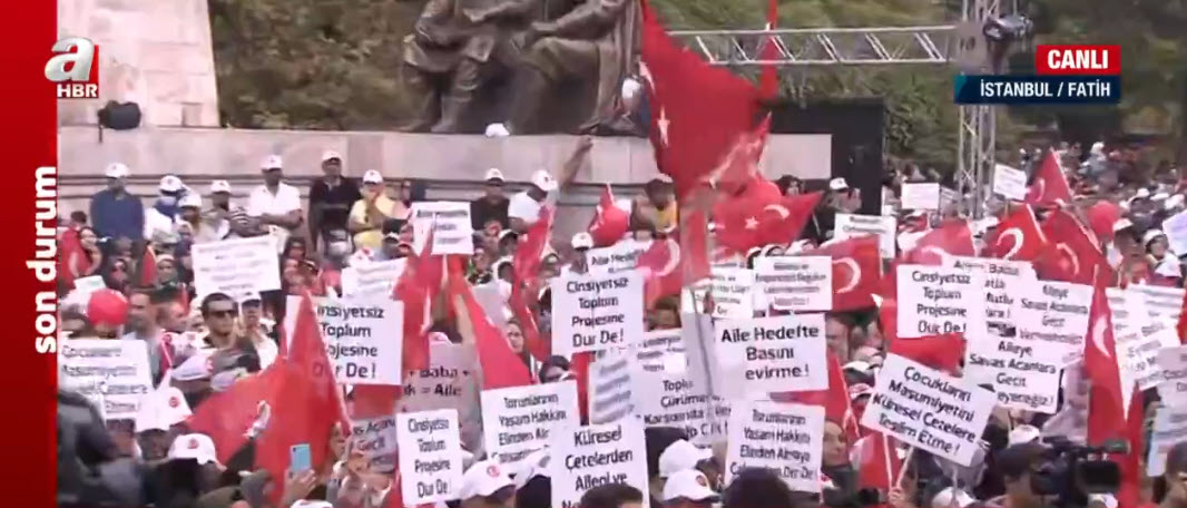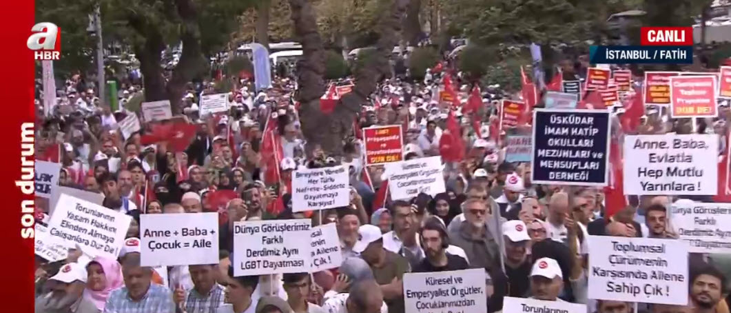Çocukların LGBT dayatmasından korunması için İstanbul Saraçhane Parkı'nda yürüyüş düzenlendi. Büyük Aile Yürüyüşü olarak adlandırılan bu etkinliğe yoğun katılım oldu. A Haber muhabiri Mehmet Karataş o noktadan detayları aktardı. Oyuncu Bahadır Yenişehirlioğlu, A Haber'e yaptığı açıklamada "Aileyi kaybetmek istemiyoruz. Geleneklerimizi kaybetmek istemiyoruz. Küresel bir dayatmaya hayır diyoruz." dedi.