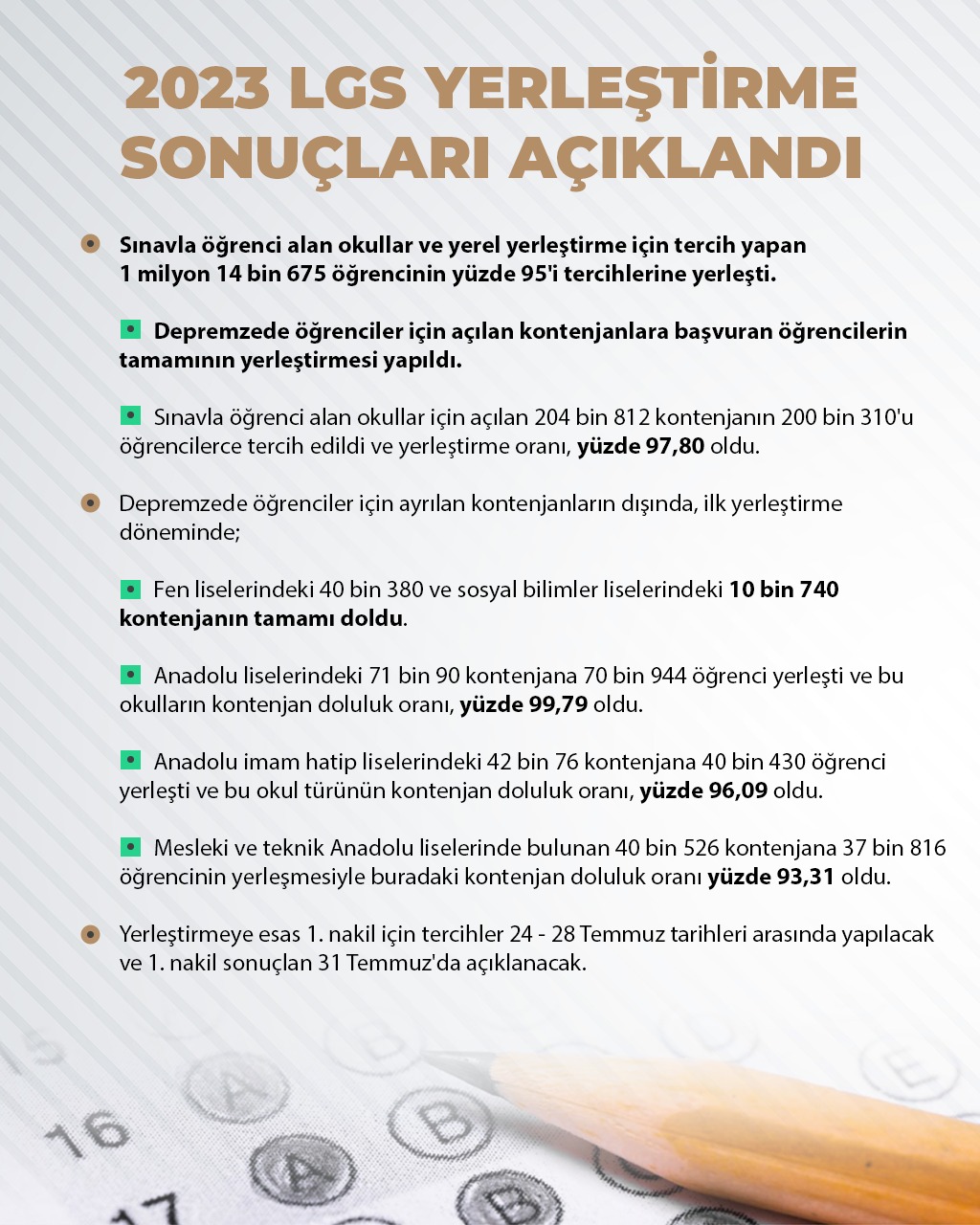Milli Eğitim Bakanlığı, Liselere Geçiş Sistemi (LGS) kapsamındaki yerleştirme sonuçlarını, http://meb.gov.tr internet adresinden açıkladı.