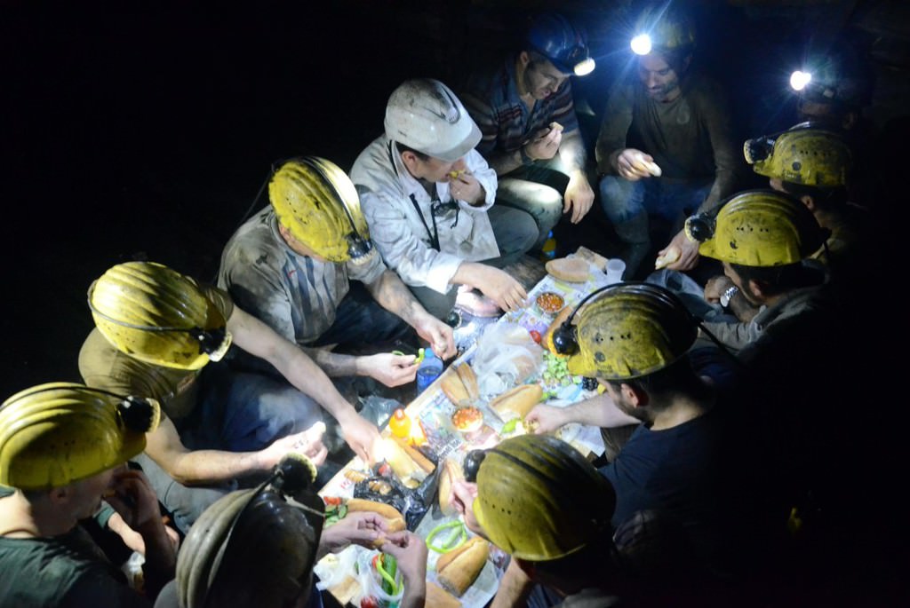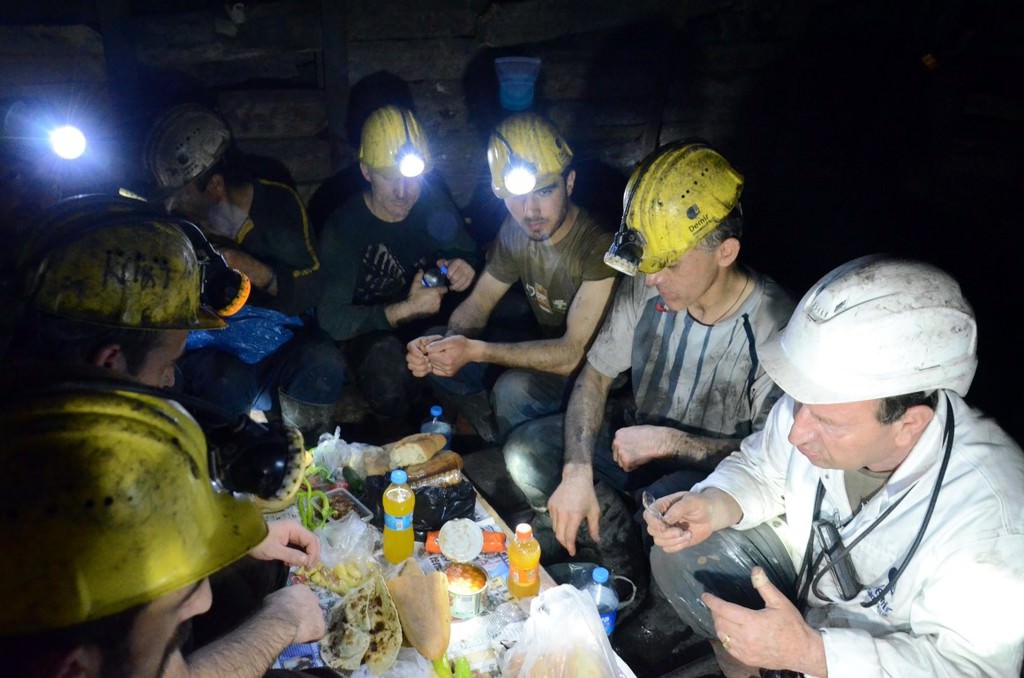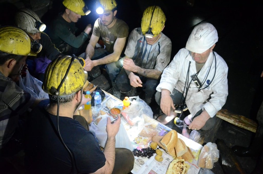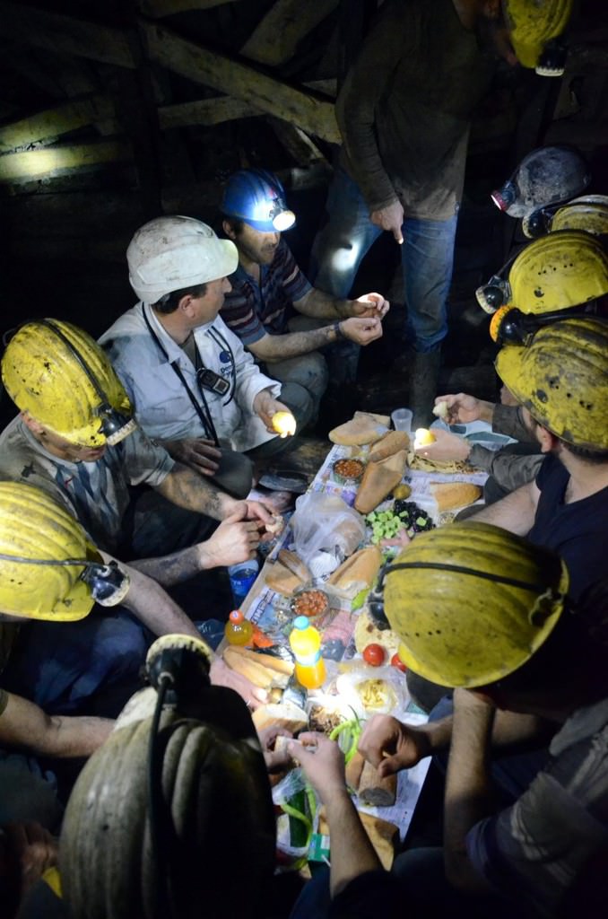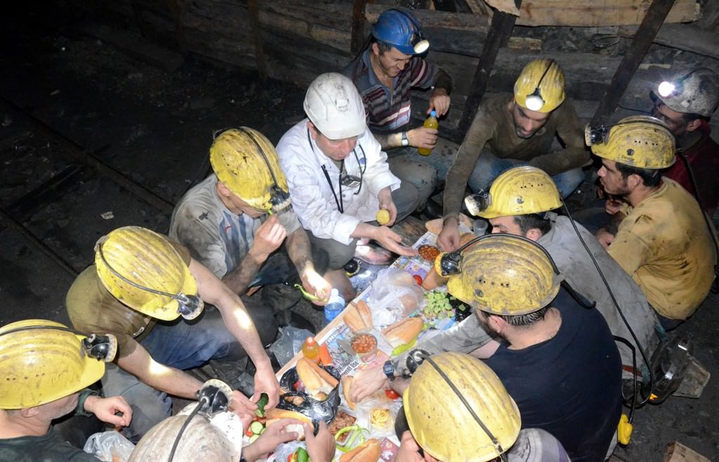 Zonguldak'ın Kilimli ilçesine bağlı Gelik beldesindeki özel maden ocağı firmasında 00.00-08.00 mesaisinde çalışan işçiler, sahur vaktinin yaklaşmasıyla baretlerinin ışığının aydınlattığı karanlık dehlizde ahşap direk ve kalaslardan sofralarını oluşturdu.