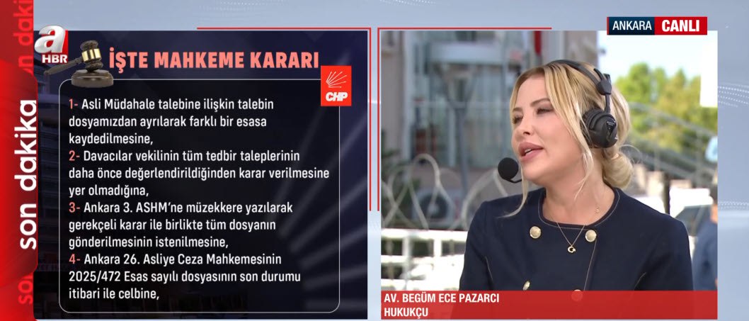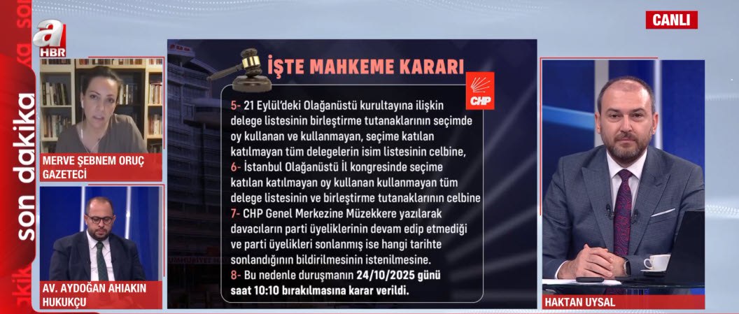 CHP'de Özgür Özel'in genel başkanlık koltuğunu Kemal Kılıçdaroğlu'ndan devraldığı şaibeli kurultay ile ilgili dava 24 Ekim 2025 tarihine ertelendi. Mahkemenin kararı sonrası "Şimdi ne olacak?" sorusu gündeme gelirken, Haktan Uysal'ın sunduğu Ajans Bugün programına konuk olan Gazeteci Merve Şebnem Oruç, Avukat Aydoğan Ahıakın ve Prof Dr. Selami Kuran kararı değerlendirdi. Öte yandan mahkemenin yapıldığı adliyenin önünde A Haber Parlamento Şefi Tülay Ağaoğlu'nun konuğu olan Avukat Begüm Ece Pazarcı da değerlendirmelerde bulundu. İstanbul 2 No'lu Barosu Başkanı Yasin Şamlı ve Gazeteci Emin Pazarcı da kararı yorumladı.