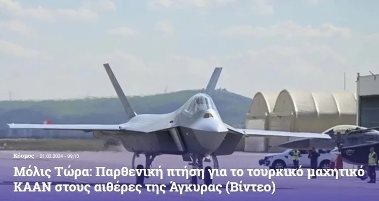 Milli Muharip Uçak KAAN, sabah saatlerinde Mürted Hava Meydanı'nda piste çıkarak motor çalıştırdı ve ilk uçuşunu başarıyla gerçekleştirdi. Cumhurbaşkanlığı İletişim Başkanlığı'ndan yapılan açıklamada, KAAN ile Türkiye'nin dünyada 5. nesil uçak üretebilen 5 ülkeden biri olacağına dikkat çekildi. KAAN'ın gökyüzü ile buluştuğu tarihi anların ardından ilk panik manşeti Yunanistan'dan geldi. Proto Thema gazetesi, uçuşa dair görüntünün paylaşıldığı haberde, "Çift motorlu hayalet uçak" ifadesine yer verildi.