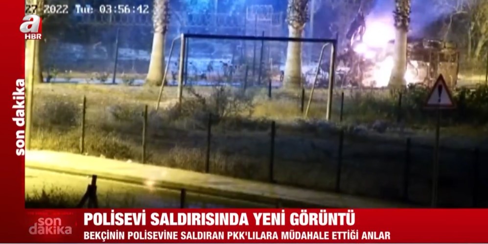 Mersin Mezitli'de polisevine PKK'lı teröristler tarafından yapılan saldırının yeni görüntüleri ortaya çıktı. Hain saldırıda bekçilerin teröristlerle çatışarak ilerlemelerini önleme anları böyle görüntülendi. Çatışma anlarına ilişkin görüntülerde, bekçinin yere yatarak teröristlerle çatıştığı görülüyor.