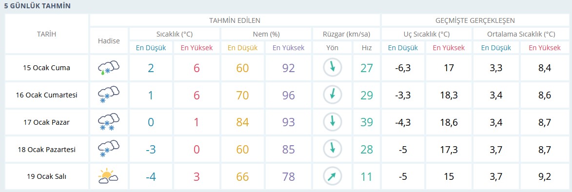 "Meteoroloji Genel Müdürlüğü 1. Bölge Müdürlüğü'nden alınan hava tahmin raporunda, Cuma günü (15 Ocak) ilk saatlerde İstanbul genelinde karla karışık yağmur olarak başlayacak yağışların kar yağışına dönüşerek öğle saatlerine kadar sürmesi beklenmektedir. Cumartesi günü (16 Ocak) öğle saatlerinden itibaren karla karışık yağmur ve akşam saatlerinden itibaren kar yağışlı geçeceği tahmin edilen havanın, Pazar günü (17 Ocak) yoğun kar yağışlı olacağı ve Pazartesi günü (18 Ocak), akşam saatlerine kadar aralıklı olarak kar yağışlı geçeceği tahmin edilmektedir."