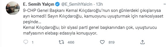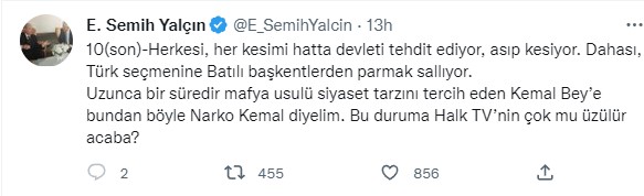 Milliyetçi Hareket Partisi (MHP) Genel Başkan Yardımcısı ve İstanbul Milletvekili Semih Yalçın, Cumhuriyet Halk Partisi (CHP) Genel Başkanı Kemal Kılıçdaroğlu'nun son zamanlardaki tutumuna sert ifadelerle yüklendi. Sosyal medya hesabı üzerinden paylaşım yapan Yalçın, "CHP Genel Başkanı Kemal Kılıçdaroğlu'nun son günlerdeki çıkışlarıysa ayrı komedi. Kamuoyunu uyuşturmak için narkosiyaset peşinde. Bir siyasi parti genel başkanından çok, uyuşturucu mafyasının elebaşı edasıyla konuşuyor. Herkesi, her kesimi hatta devleti tehdit ediyor, asıp kesiyor. Dahası, Türk seçmenine Batılı başkentlerden parmak sallıyor. Uzunca bir süredir mafya usulü siyaset tarzını tercih eden Kemal Bey'e bundan böyle Narko Kemal diyelim. Bu duruma Halk TV'nin çok mu üzülür acaba?" dedi.