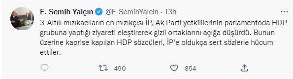 3- Altılı mızıkacıların en mızıkçısı İP, Ak Parti yetkililerinin parlamentoda HDP grubuna yaptığı ziyareti eleştirerek gizli ortaklarını açığa düşürdü. Bunun üzerine kaprise kapılan HDP sözcüleri, İP'e oldukça sert sözlerle hücum ettiler.