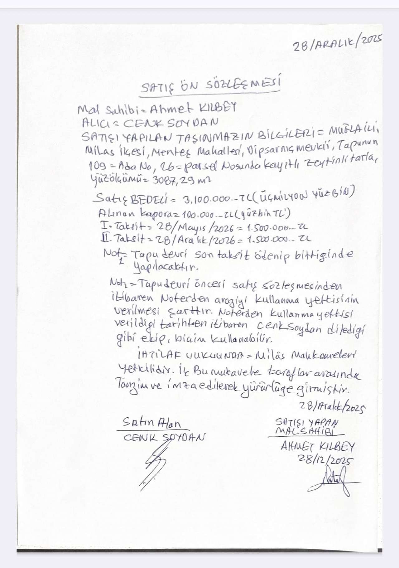 Kamuoyuna yansıyan görüntülerin ardından yazılı açıklama yapan Kılbey, 29 Aralık 2025 tarihi itibarıyla Milas 1. Noterliği'nde düzenlenen resmi vekâletname ve satış sözleşmeleriyle taşınmaz üzerindeki tüm tasarruf, kullanım ve işlem yetkilerini devrettiğini, bu tarihten sonra söz konusu araziyle hukuki bağının sona erdiğini savundu.