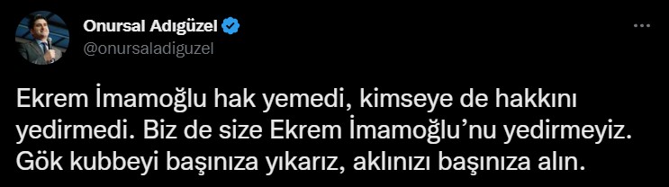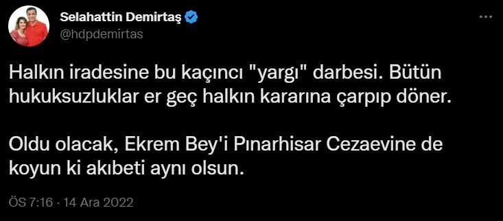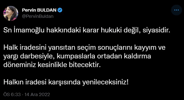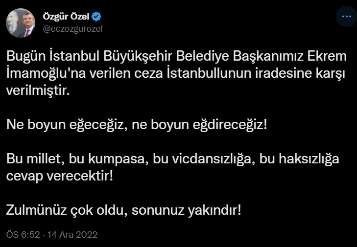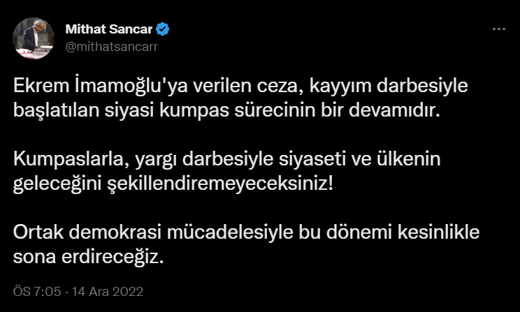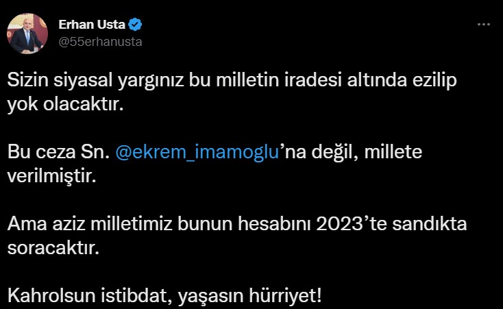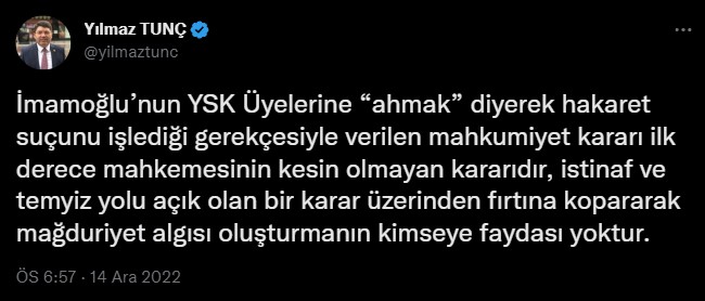 İstanbul Büyükşehir Belediye (İBB) Başkanı CHP'li Ekrem İmamoğlu'nun Yüksek Seçim Kurulu (YSK) üyelerine hakaret ettiği gerekçesiyle açılan davada karar açıklandı. İstanbul 7. Asliye Ceza Mahkemesi, Ekrem İmamoğlu hakkında 2 yıl 7 ay 15 gün mahkumiyet verdi. Şu an için nihayete ermeyen karar, İstinaf Mahkemesi ve Yargıtay'da kesinleşirse İmamoğlu'nun belediye başkanlığı düşecek, hiçbir seçimde aday olamayacak. Adalet Bakanı Bekir Bozdağ, karara ilişkin yaptığı açıklamada,"Bu karara karşı istinaf ve temyiz yolu açıktır. Yargılama süreci devam etmektedir." diye konuştu. AK Parti Grup Başkanvekili Yılmaz Tunç ise A Haber canlı yayınında,, İmamoğlu hakkında verilen mahkumiyet kararına ilişkin, "İstinaf ve temyiz yolu açık olan bir karar üzerinden fırtına kopararak mağduriyet algısı oluşturmanın kimseye faydası yoktur." ifadesini kullandı. Söz konusu gelişme üzerinden muhalefet kanadı, iktidarı yargıyı baskı altına almakla itham etti. Birçok vekil, yargının verdiği kararı AK Parti hükümetine mal ederek siyaset devşirmeye çalıştı. Oysa, İmamoğlu'nun davasındaki hakim hakkında CHP vekili Ali Mahir Başarır, "Hakimi tanıyorum, adil ve tarafsız karar verir." açıklamasında bulunmuştu. Hakimin kendilerinin aleyhine verilen kararını hiçe sayan muhalefetin tutumu tepki çekti.