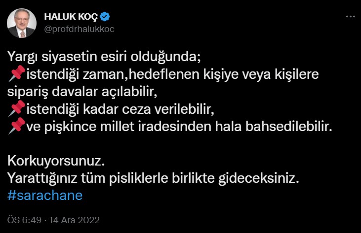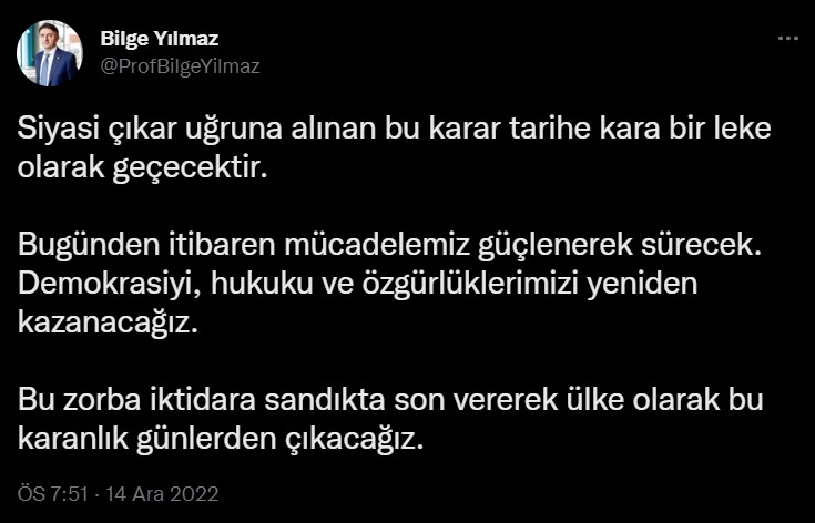 "İstanbul Anadolu 7. Asliye Ceza Mahkemesinin verdiği karar kesinleşmiş, nihai bir karar değildir. Bu karara karşı istinaf ve temyiz yolu açıktır. İlk derece mahkemelerinin verdiği kararlar, hukukumuzun öngördüğü yargı mercii tarafından da denetlenmektedir. Bu karar da istinaf ve Yargıtay denetimine açıktır. Yargılama süreci devam etmektedir."