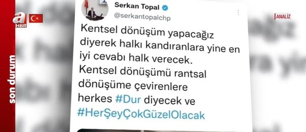 CHP Hatay Milletvekili Serkan Topal'da 2019'da yaptığı paylaşımda Hatay için planlanan kentsel dönüşüme 'dur' dediği ortaya çıktı. CHP Antakya Belediye Başkan Adayı Hikmet Hatunoğlu'nun seçim vaadi ise "kentsel dönüşüme hayır"dı.