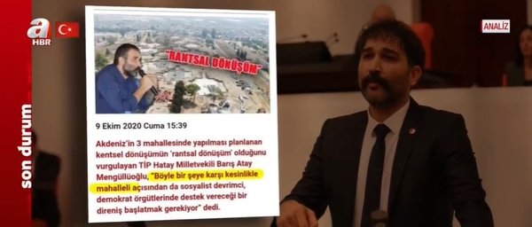 Gece gündüz kara propaganda peşine olan Türkiye İşçi Partisi Hatay Milletvekili Barış Atay'ın 2020'de kentsel dönüşümlere de karşı çıkarak insanları örgütlenmeye davet ettiği görüldü.