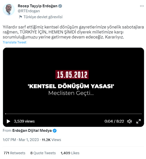 Başkan Erdoğan sosyal medya hesabından da "Yıllardır sarf ettiğimiz kentsel dönüşüm gayretlerimize yönelik sabotajlara rağmen, TÜRKİYE İÇİN, HEMEN ŞİMDİ diyerek milletimize karşı sorumluluğumuzu yerine getirmeye devam edeceğiz. Kararlıyız." ifadeleriyle videoyu paylaştı.