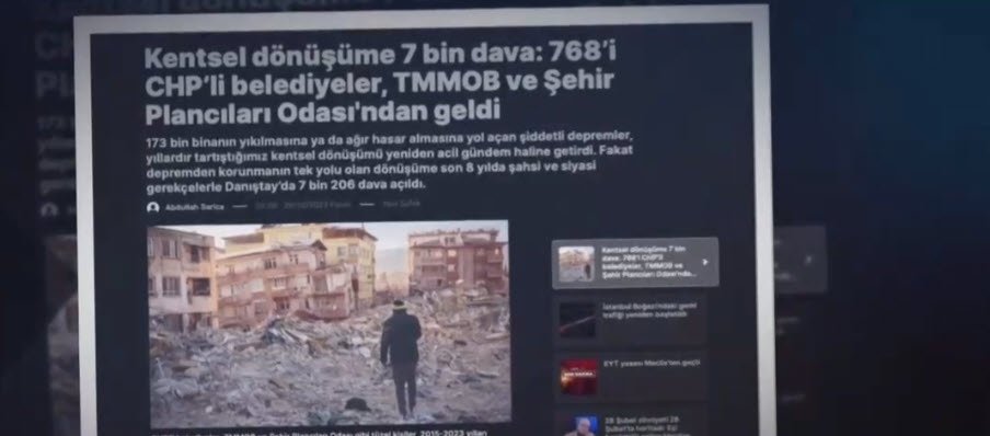 Muhalefetin kentsel dönüşüm çabalarını engellemesine tepki gösteren Başkan Erdoğan, "Bu hayırlı ve hayati gayretimizin her adımında yaşadığımız zorlukları önümüze çıkartılan siyasi ve onun bir parçası haline dönüşen hukuki engelleri en iyi sizler biliyorsunuz. Ülkemizdeki kentsel dönüşüm projeleri konusunda bizim gösterdiğimiz gayretleri ve buna yönelik sabotajları şöyle bir hatırlayalım." şeklinde konuşarak bir video izletti.