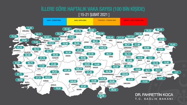 ÇOK YÜKSEK KORONAVİRÜS RİSKİ (KIRMIZI): Yüz binde 100'ün üstünde vaka seyri görülen iller.