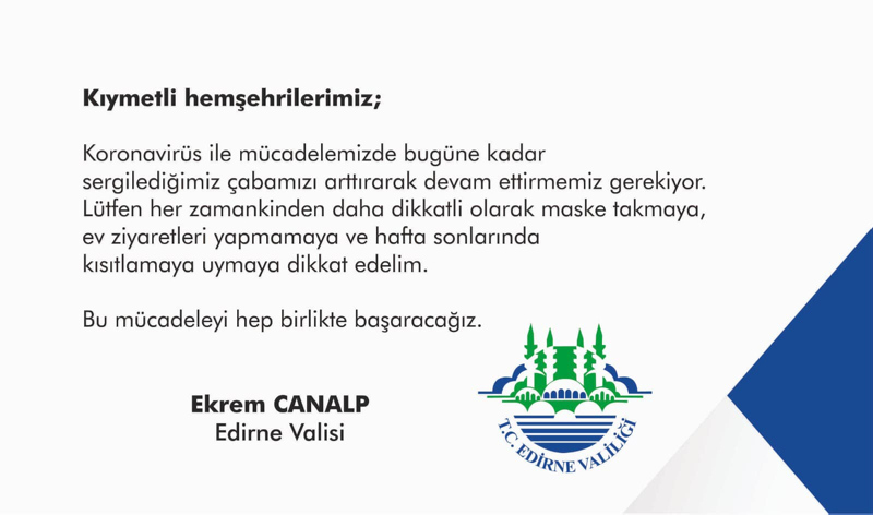 Edirne Valiliği, koronavirüs vakalarının artması nedeniyle vatandaşları, cep telefonlarına SMS göndererek, dikkatli olmaları yönünde uyardı. Edirne Valisi Ekrem Canalp'in talimatıyla vatandaşların cep telefonlarına bilgilendirici SMS gönderilmeye başlandı. Mesajda "Kıymetli hemşehrilerimiz, koronavirüs ile mücadelemizde bugüne kadar sergilediğimiz çabamızı arttırarak devam ettirmemiz gerekiyor. Lütfen her zamankinden daha dikkatli olarak maske takmaya, ev ziyaretleri yapmamaya ve hafta sonlarında kısıtlamaya uymaya dikkat edelim. Bu mücadeleyi hep birlikte başaracağız" ifadeleri yer aldı.