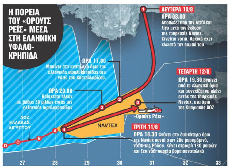 Ta Nea gazetesi ise, Türkiye'nin ilan ettiği NAVTEX'in beşinci gününe girilirken Oruç Reis'in bölgede halen aktif olduğunu, Perşembe öğle saatlerinde yeniden Yunan kıta sahanlığına girdiğini ileri sürdü. Ta Nea, Oruç Reis ve Türk filosunun Yunan donanması tarafından yaklaşık 5 mil uzaklıktan izlendiğini savundu.