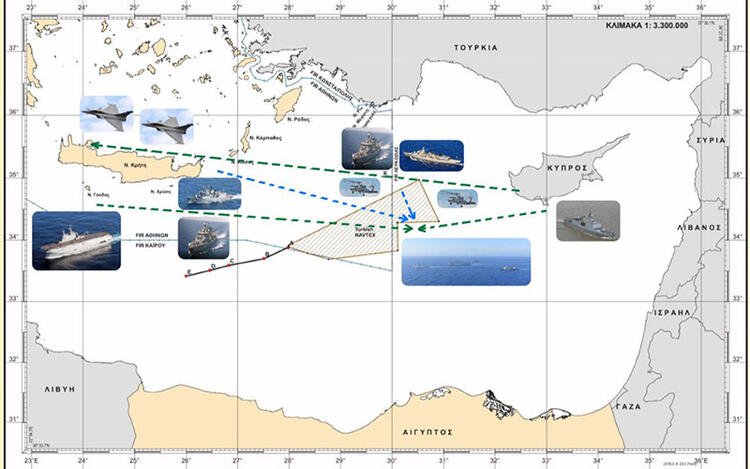 Perşembe günü saatlerinde başlayan tatbikattan ilk fotoğrafları yayınlayan Yunan medyası, gösteriye Spetai, Aegean, Lemnos ve Koundouriotis fırkateynlerinin yanı sıra bir Fransız fırkateyninin katıldığını bildirdi.