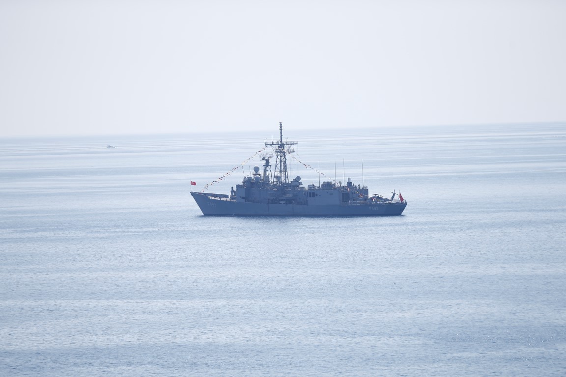 Antalya Sahili açıklarında demirleyen ve üzerine dev Türk bayrağı bulunan gemiye vatandaşlar ilgi gösterdi. Hücum botunun da eşlik ettiği geminin daha sonra Mersin'e hareket etmesi bekleniyor.