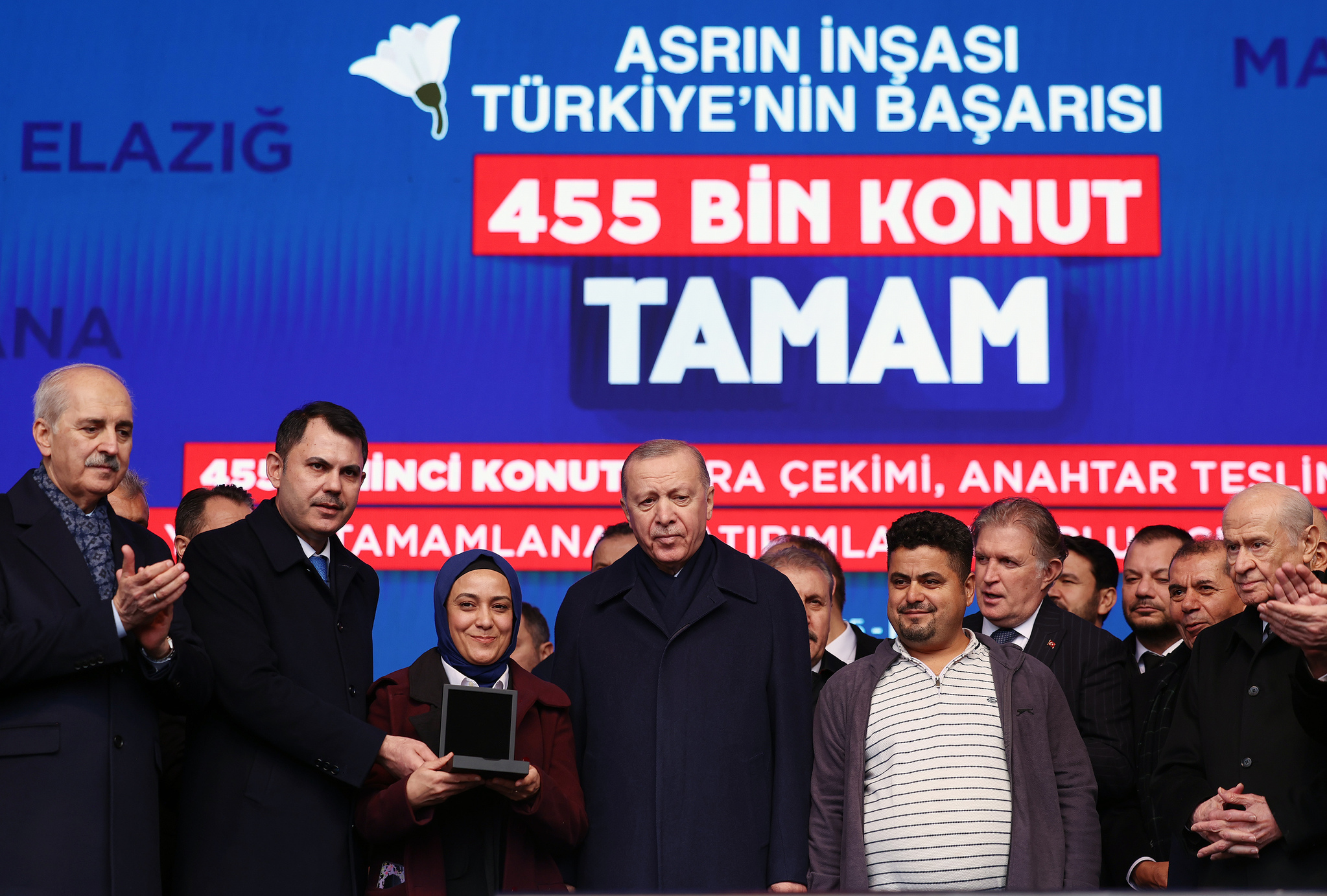 -24 Ocak 2025'te Malatya'da 201 bininci konutun, 19 Haziran 2025'te Kahramanmaraş'ta 250 bininci konutun, 6 Eylül 2025'te Malatya'da 300 bininci konutun, 15 Kasım 2025'te Adıyaman'da 350 bininci konutun anahtarları hak sahiplerine teslim edildi. 27 Aralık 2025'te ise Hatay'da Başkan Recep Tayyip Erdoğan'ın katıldığı "Asrın İnşası Türkiye'nin Başarısı: 455 Bin Konut Tamam" töreni ile Asrın İnşa Seferberliği 367 bin 995'i konut, 65 bin 672'si köy evi, 21 bin 690'ı iş yeri olmak üzere toplam 455 bin 357 bağımsız bölümün inşasının bitirilmesiyle tamamlanmış oldu.
