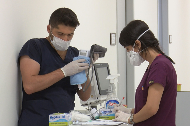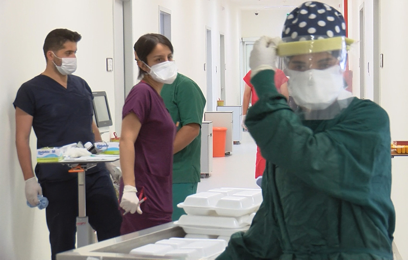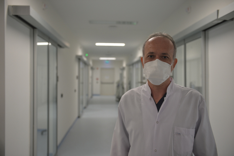 "İlhan Varank Eğitim Araştırma Hastanesi'nde yoğun bakımda bölümlemeler yapmıştık. İzole odalar oluşturup pozitif basınçlı normal odaları negatif basınca çevirmiştik. Yani normal anestezi veya yoğun bakım odalarını koronaya ve salgına uyumlu hale getirmiştik. Ama buradaki odalar en baştan o şekilde dizayn edildi. Bunlar her şeyden önce personelimizi korumak için önemli. Hastalığın yayılmasını da engellemek adına da faydalı. Sağlık personelimiz sadece hasta odalarına girerken ekstra koruyucu ekipmanlarını giyiyor. Eldiven, galoş, bone, sadece yüzü açıkta bırakan tulum, maskeler ve gözlük ile koruyucu siper giyerek hastanın yanına giriyoruz. Özellikle aerosol oluşturan işlemler dediğimiz, hastaya ağız burundan yapılan girişimler, entübasyon gibi işlemler, ortama damlacık yayabilecek riskli durumlar söz konusu. Hasta odasından ilk kapıdan ara bölgeye çıkar çıkmaz da enfekte kıyafetler çıkarılıp tıbbi atık olarak çöpe atılıyor. O kıyafetlerle bu koridorlara çıktıkları anda risk oluşturabilirler. Yoğun bakım uzmanları, sağlık personellerimiz, acilde çalışan arkadaşlarımız, en ön saflarda mücadele veriyor. Onların sağlığı bizim için çok önemli."