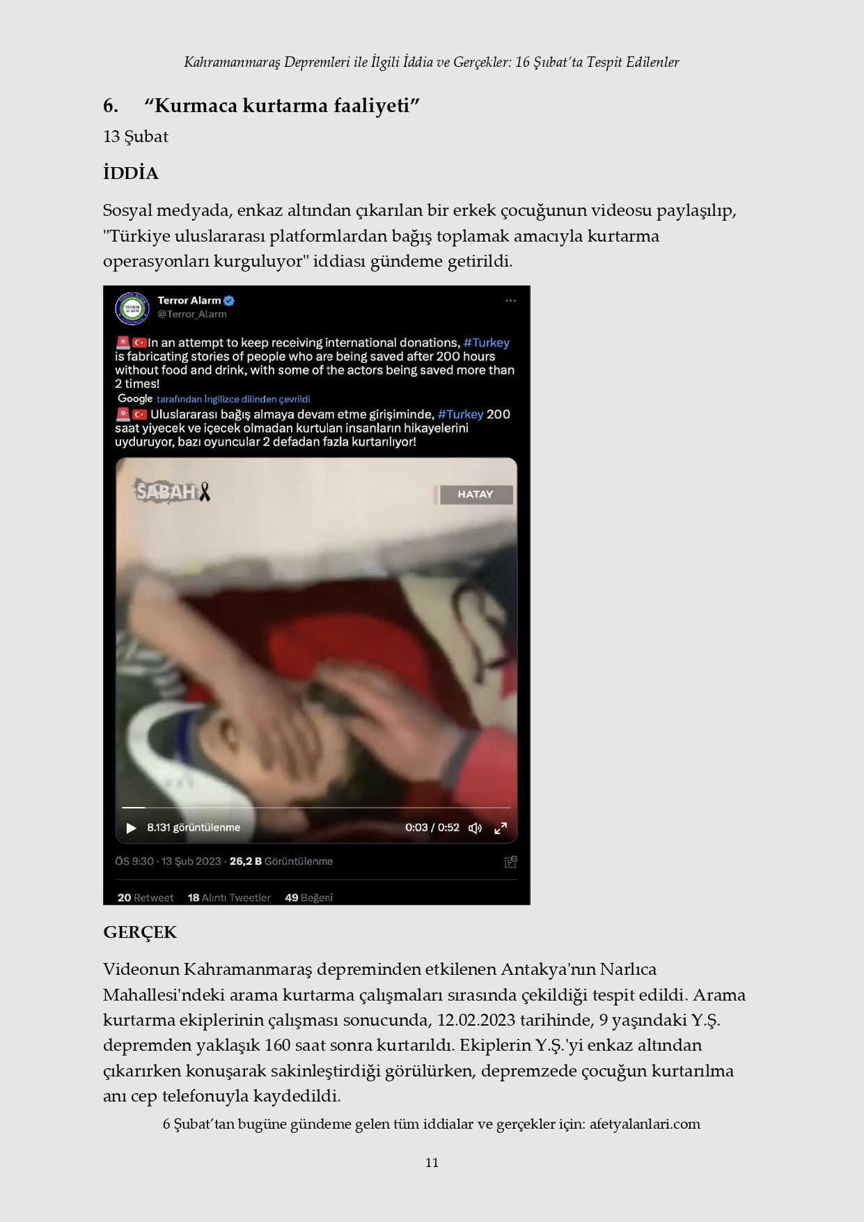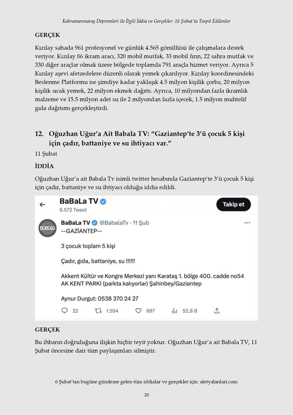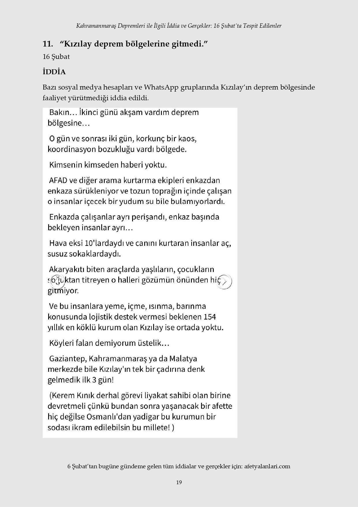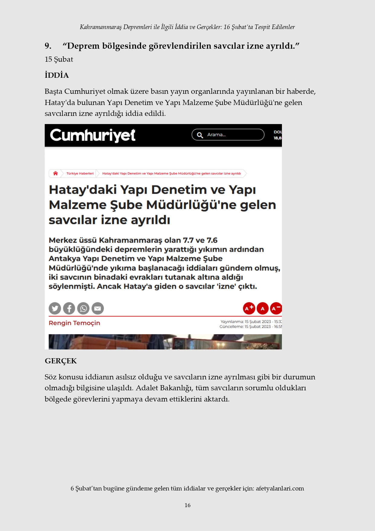Kahramanmaraş depremi sonrası devlet tüm imkanlarını depremzedeler için seferber ederken, provokatörler sosyal medya ve fondaş basın üzerinden yalanlara başladı. Depremin 12. gününe gelinmesine rağmen iftiralar devam ederken, yalan bilgiler de tek tek çürütülüyor. İşte 16 Şubat'ta tespit edilen yalanlar...