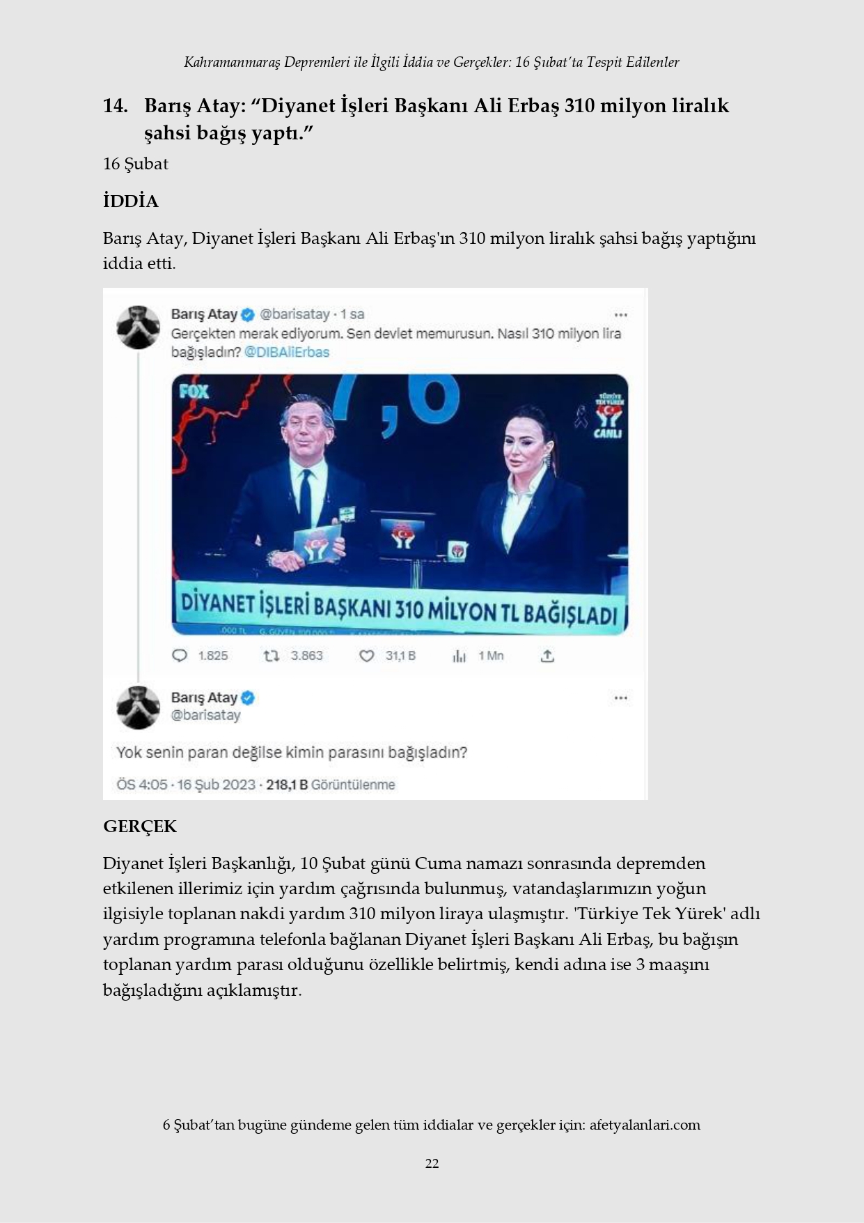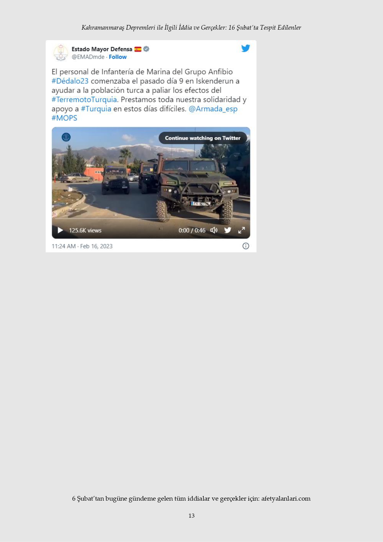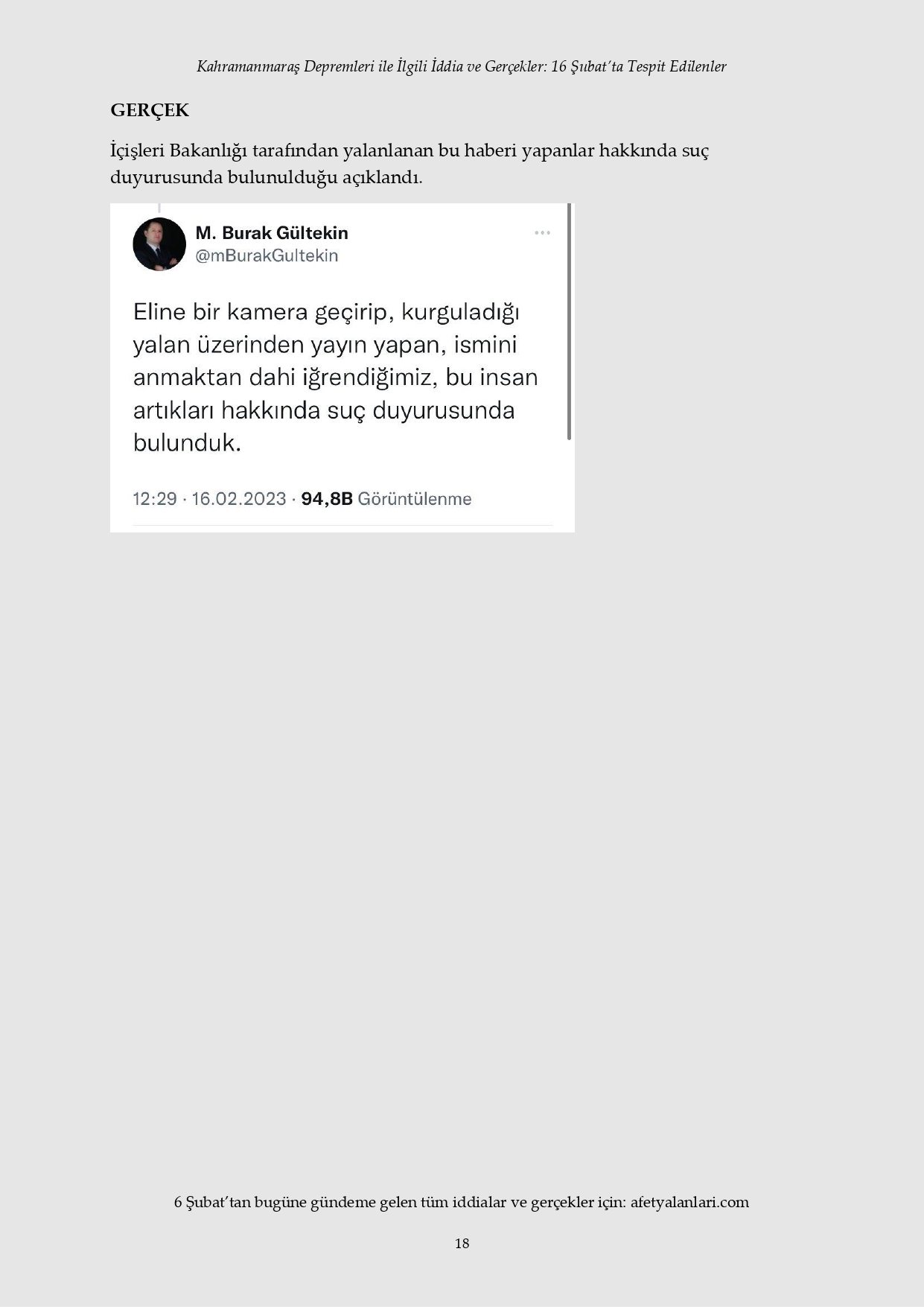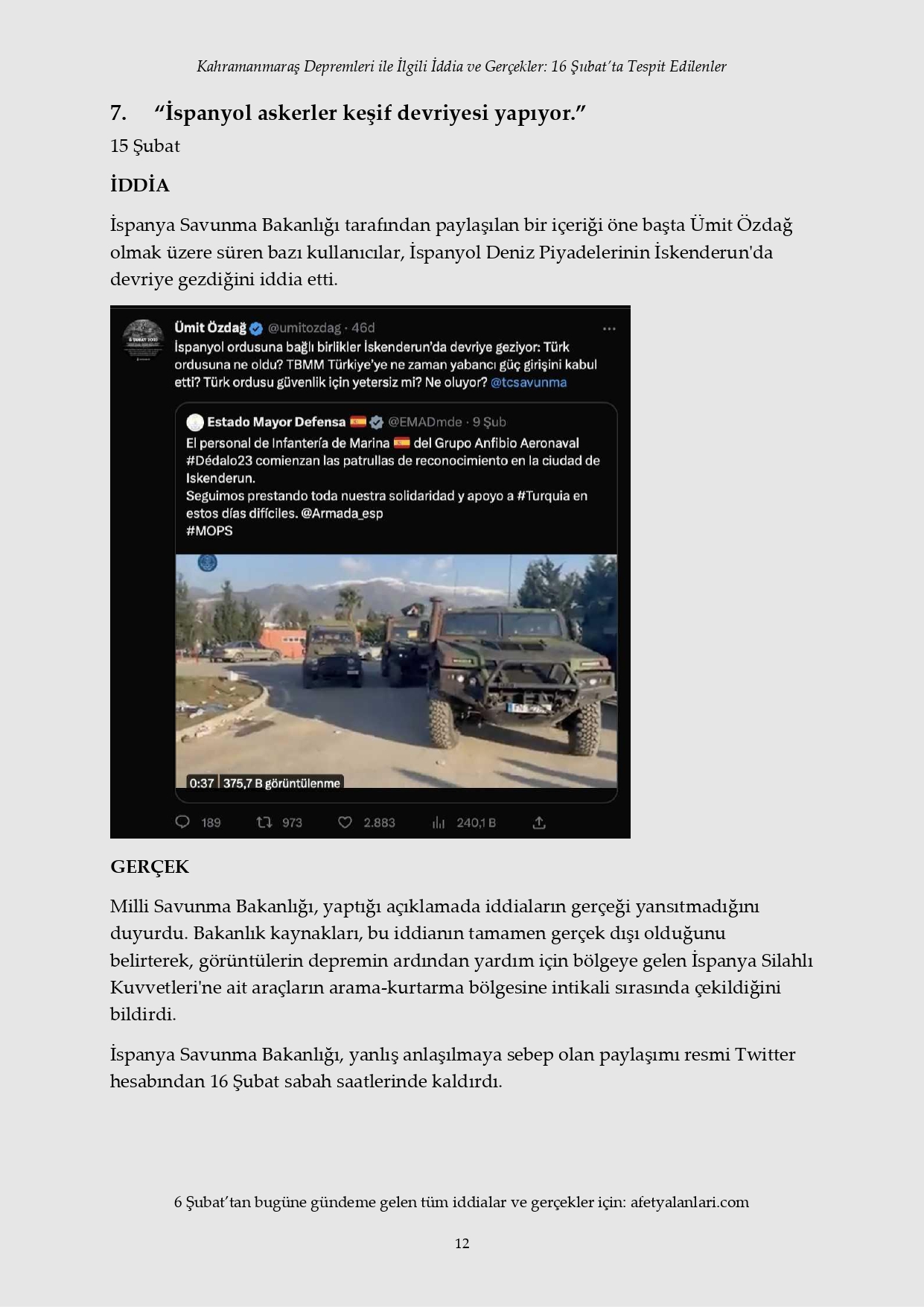Kahramanmaraş depremi sonrası devlet tüm imkanlarını depremzedeler için seferber ederken, provokatörler sosyal medya ve fondaş basın üzerinden yalanlara başladı. Depremin 12. gününe gelinmesine rağmen iftiralar devam ederken, yalan bilgiler de tek tek çürütülüyor. İşte 16 Şubat'ta tespit edilen yalanlar...