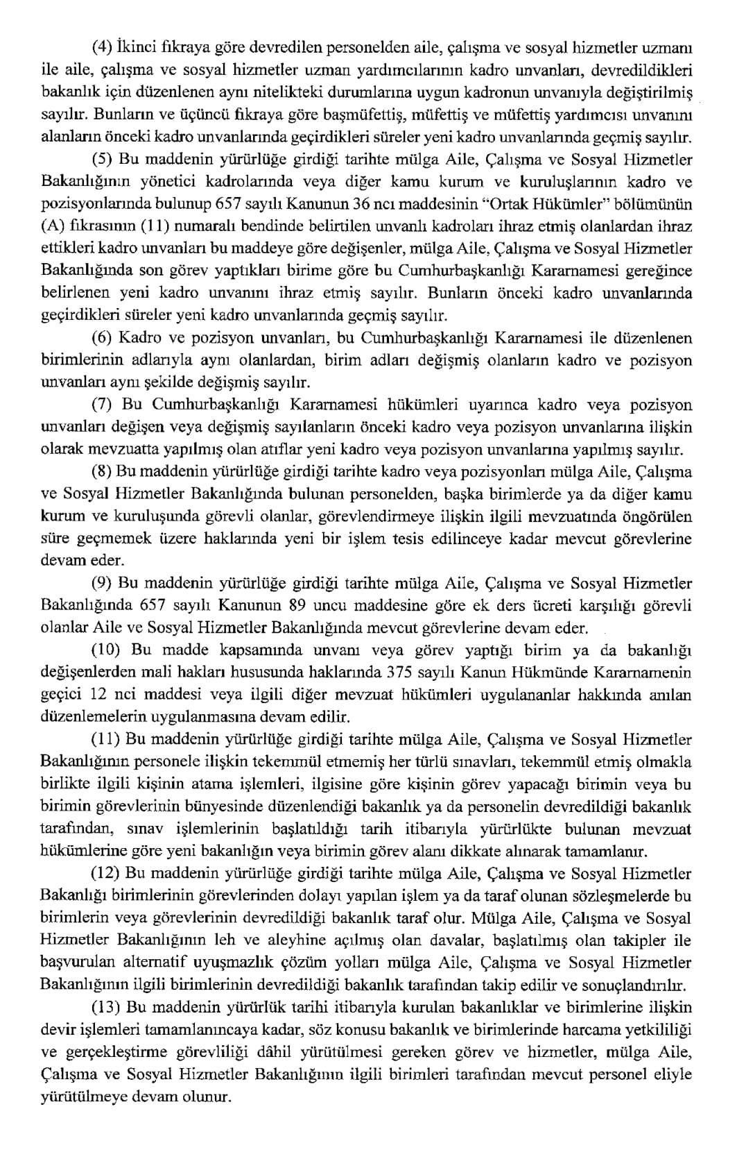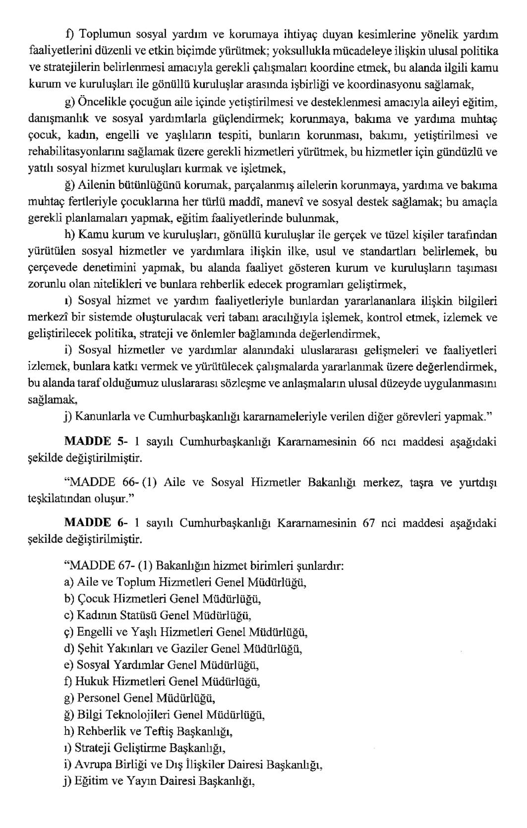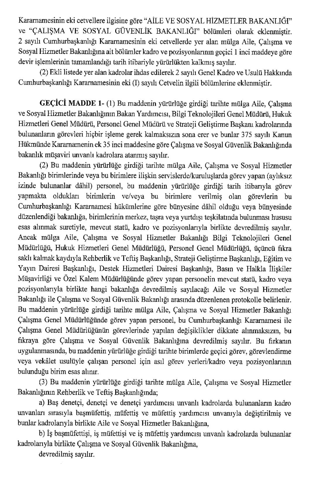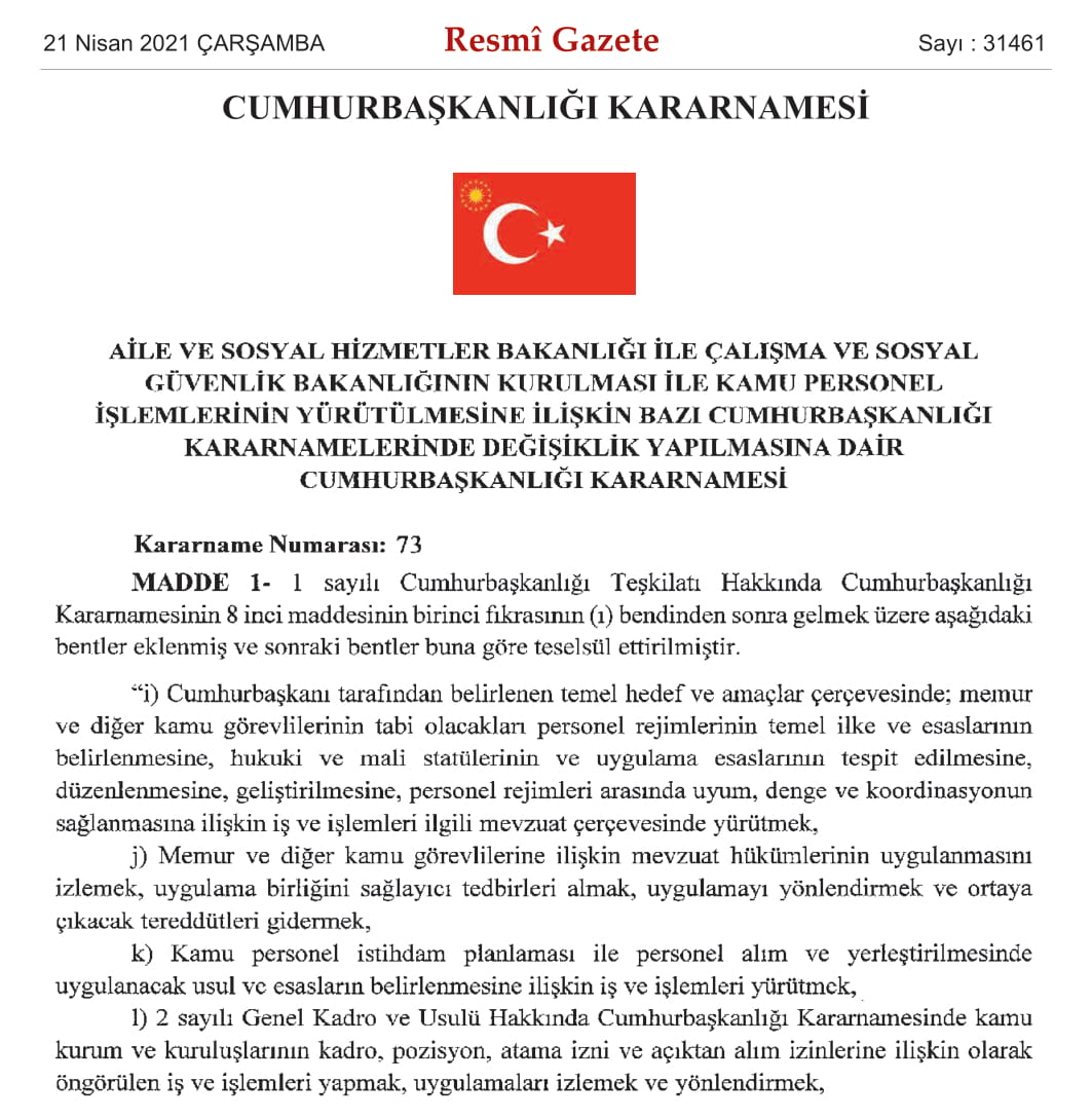 Resmi Gazete'de yayımlanan karara göre, Aile ve Sosyal Hizmetler Bakanlığı ile Çalışma ve Sosyal Güvenlik Bakanlığı kurulmasına dair Cumhurbaşkanlığı Kararnamesi yayımlandı.