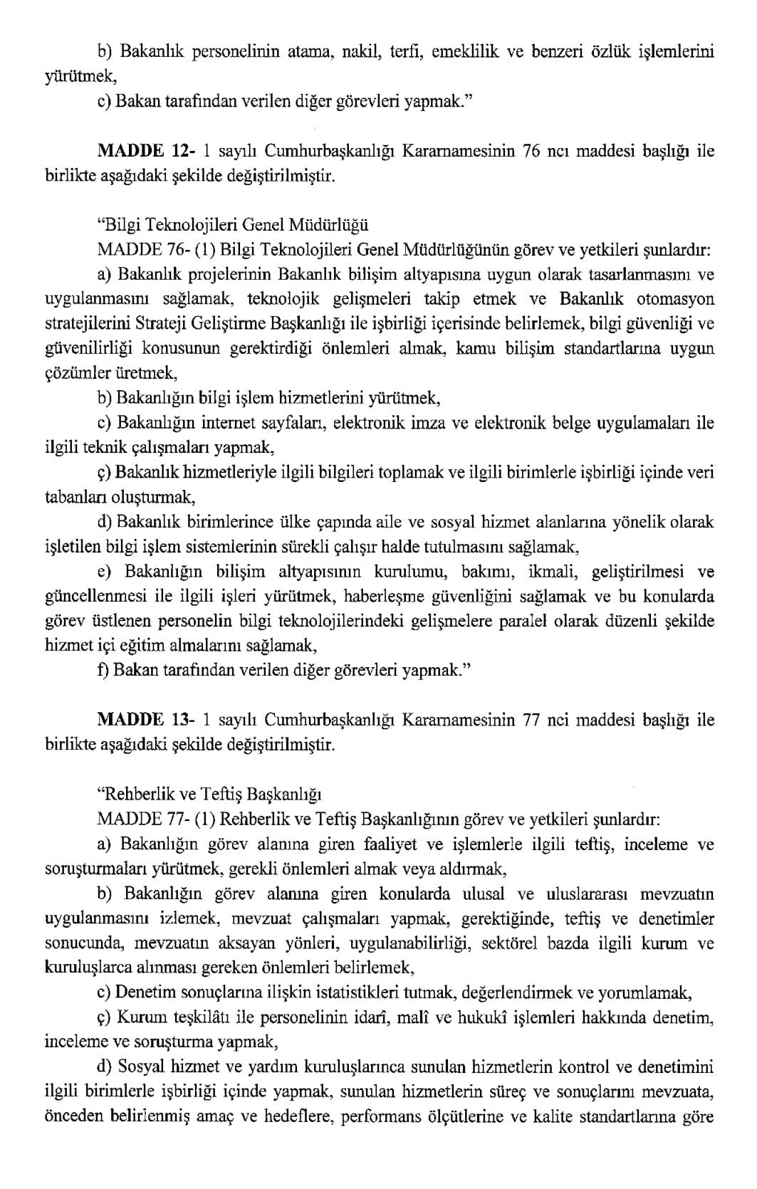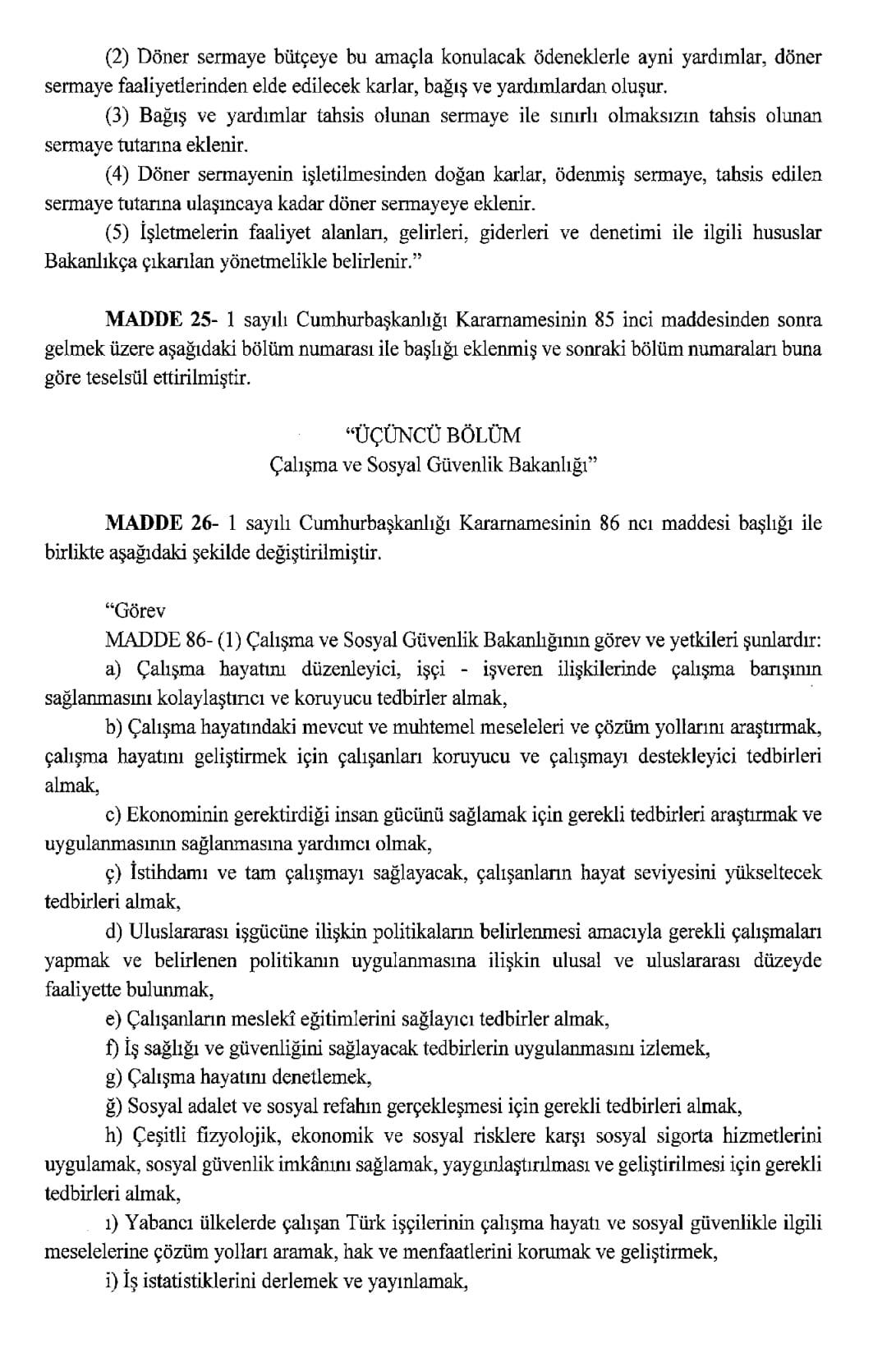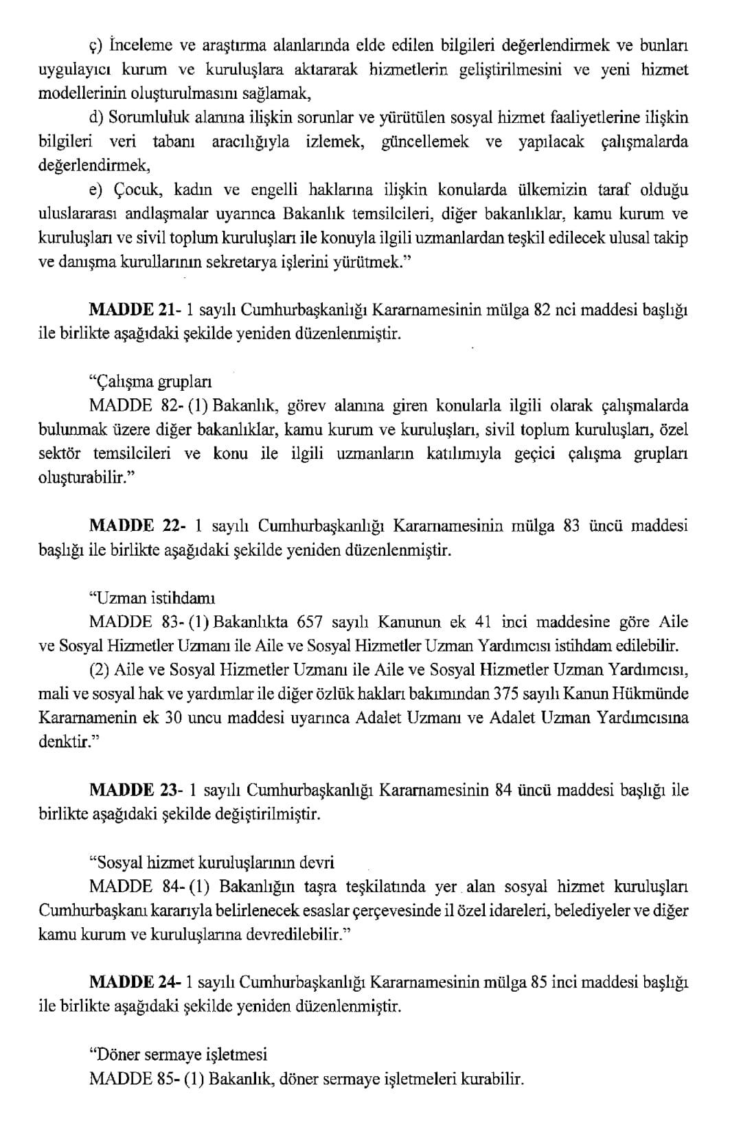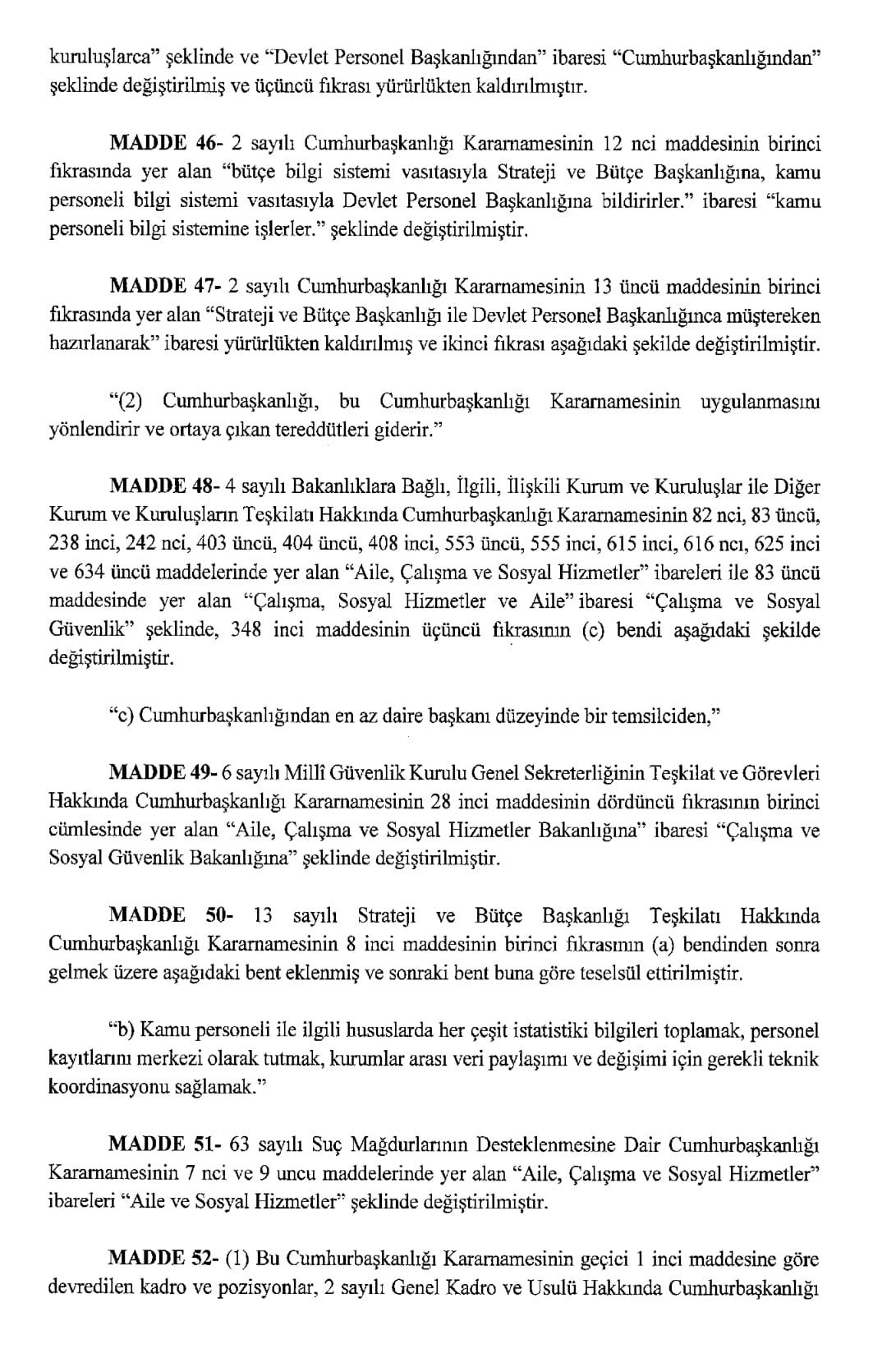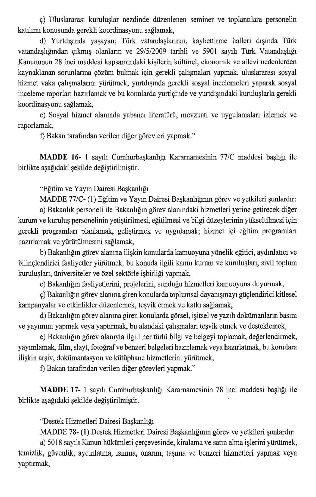 Resmi Gazete'de yayımlanan karara göre, Aile ve Sosyal Hizmetler Bakanlığı ile Çalışma ve Sosyal Güvenlik Bakanlığı kurulmasına dair Cumhurbaşkanlığı Kararnamesi yayımlandı.