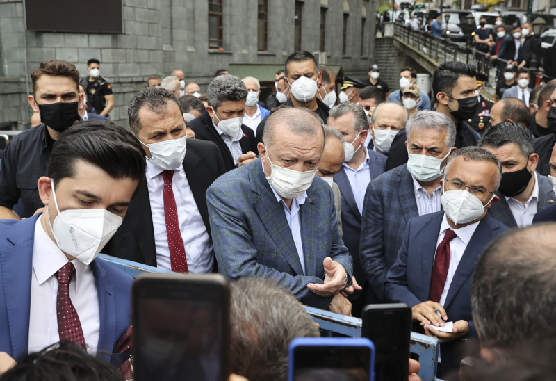 Erdoğan, şiddetli yağış nedeniyle sel ve heyelanın meydana geldiği Rize'de, AK Parti Güneysu İlçe Başkanlığı önünde vatandaşlara hitap etti.