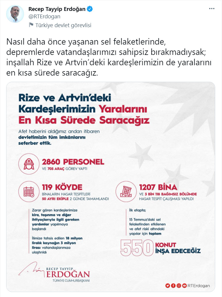 Bütün çalışmaların yakından takip edildiğini, kısa sürede sonuçlandırılması için her türlü gayreti göstereceklerini aktaran Cumhurbaşkanı Erdoğan, "Rabbim Rize'mizi, Artvin'imizi, ülkemizin her köşesini bu tür felaketlerden muhafaza buyursun diyorum." ifadelerini kullandı.