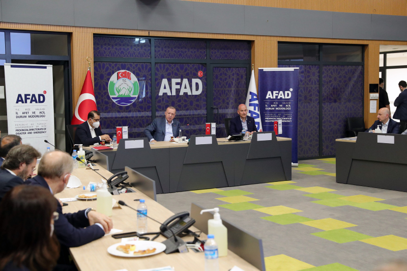 Burada koordinasyon toplantısına başkanlık eden Erdoğan, yapılan çalışmalar ve son duruma ilişkin yetkililerden bilgi aldı.