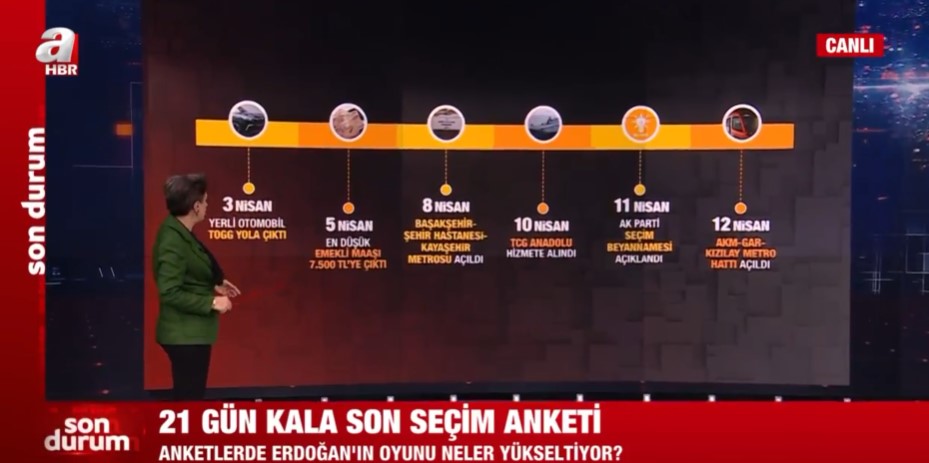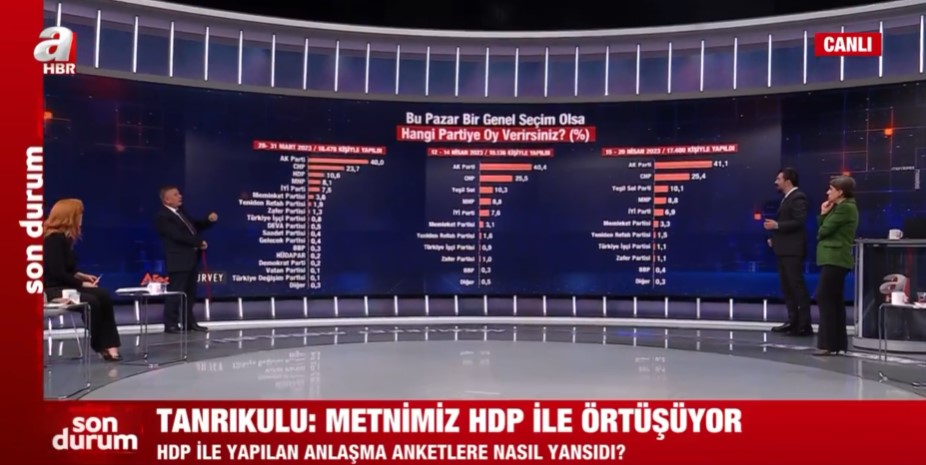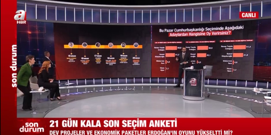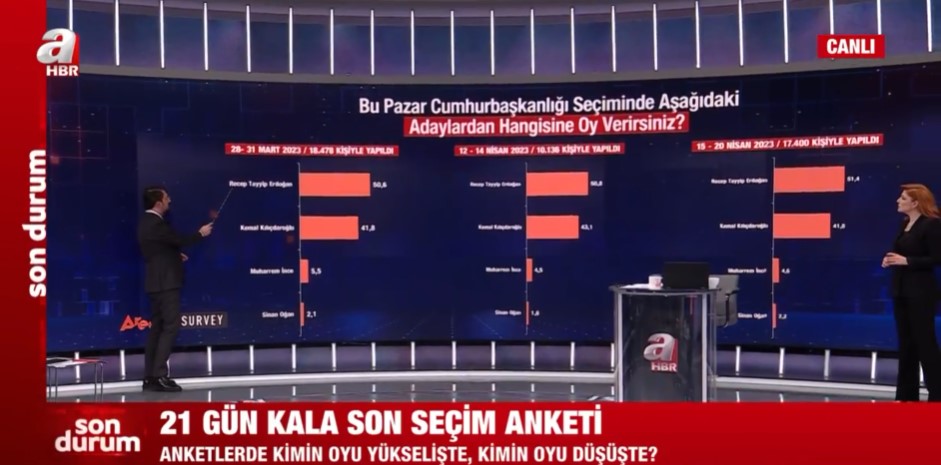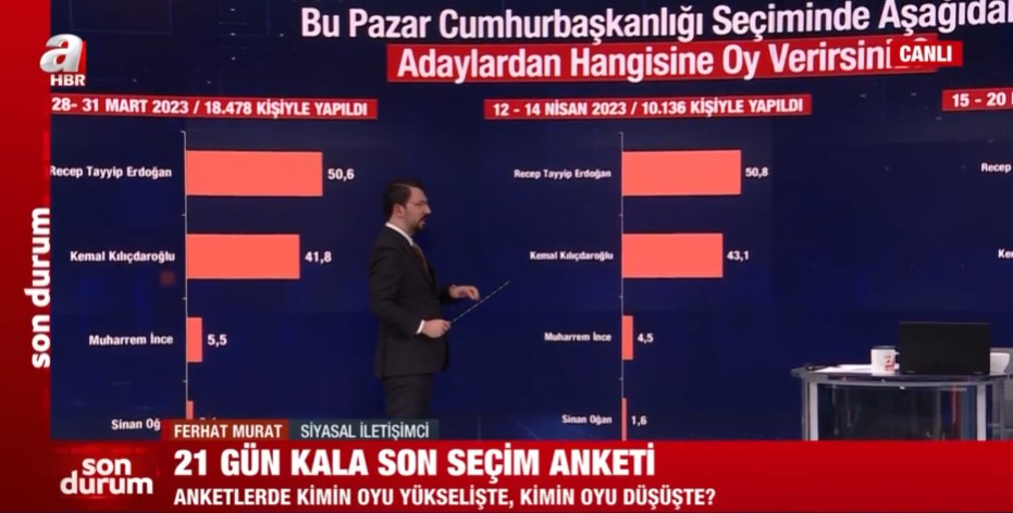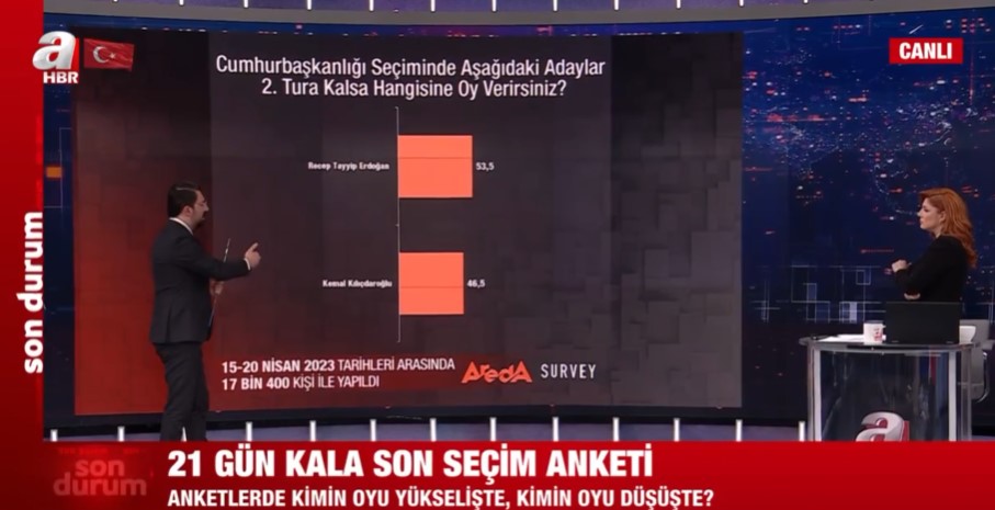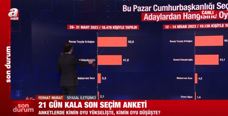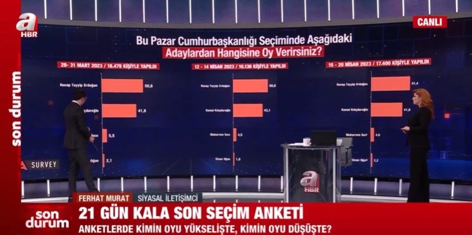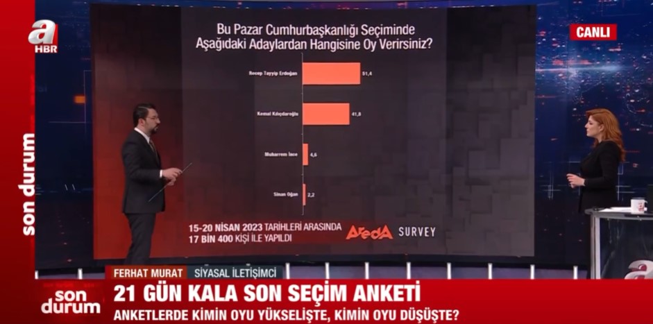 Areda Survey şirketinin 15-20 Nisan 2023 tarihleri arasında 17 bin 400 kişi ile yapılan seçim anketi sonuçları kamuoyu ile paylaşıldı. Siyasal İletişimci Ferhat Murat, yapılan son anketi A Haber ekranlarında paylaştı ve değerlendirdi.