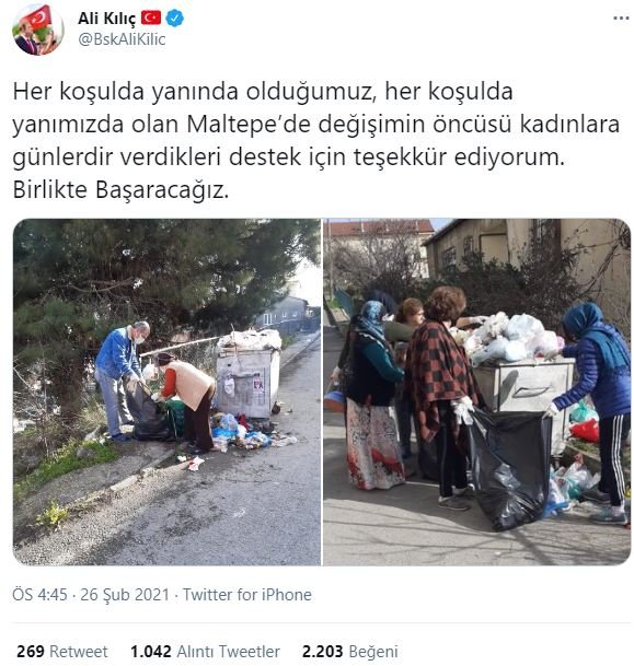İstanbul Maltepe Belediyesi'nde işçilerin greve çıkması sonrasında cadde, sokak ve semt pazarlarında çöpler toplanmadı. CHP'li Maltepe Belediye Başkanı Ali Kılıç, sosyal paylaşım sitesi Twitter'daki şahsi hesabından açıklamada bulundu ve "Her koşulda yanında olduğumuz, her koşulda yanımızda olan Maltepe'de değişimin öncüsü kadınlara günlerdir verdikleri destek için teşekkür ediyorum. Birlikte başaracağız" ifadelerini kullandı.