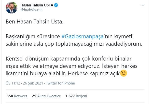 Ali Kılıç'ın, söz konusu paylaşımına siyasiler ve AK Partili belediyelerden ilginç cevaplar geldi. Gaziosmanpaşa Belediye Başkanı Hasan Tahsin Usta, "Başkanlığım süresince Gaziosmanpaşa'nın kıymetli sakinlerine asla çöp toplatmayacağımızı vaadediyorum" dedi. Çekmeköy Belediye Başkanı Ahmet Poyraz da, "Çekmeköy ailemizin içi rahat olsun 12 yıldır olduğu gibi belediye başkanlığım süresince sizlere çöp toplatmayacağimin sözünü veriyorum" diye konuştu.
