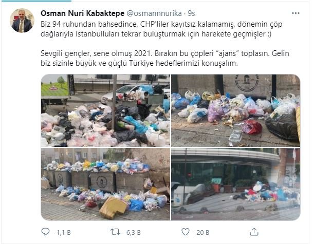 AK Parti İstanbul İl Başkanı Osman Nuri Kabaktepe, "Biz 94 ruhundan bahsedince, CHP'liler kayıtsız kalamamış, dönemin çöp dağlarıyla İstanbulluları tekrar buluşturmak için harekete geçmişler:) Sevgili gençler, sene olmuş 2021. Bırakın bu çöpleri 'ajans' toplasın. Gelin biz sizinle büyük ve güçlü Türkiye hedeflerimizi konuşalım" ifadelerini kullandı.