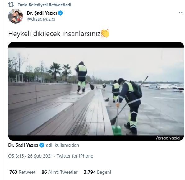 Tuzla Belediye Başkanı Dr. Şadi Yazıcı da; Tuzla sokaklarında temizlik yapan personelin videolarını sosyal medya hesabından paylaşarak, temizlik personeline "Heykeli dikilecek insanlarınız" dedi. Yazıcı, Kemal Sunal'ın Çöpçüler Kralı filminden akıllarda kalan müziği de paylaştı.