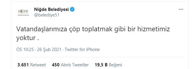 Niğde Belediyesi; "Vatandaşlarımıza çöp toplatmak gibi bir hizmetimiz yoktur" derken, Şanlıurfa Büyükşehir Belediyesi de "Vatandaşlarımızın bilgisine: Şanlıurfa'da çöp toplamak vatandaşlarımızın değil, bizlerin sorumluluğundadır" ifadelerini kullandı.