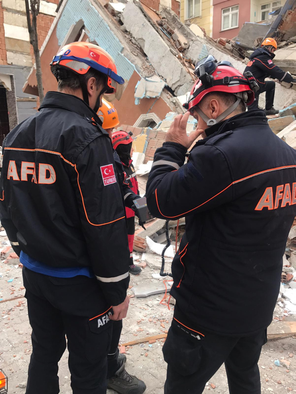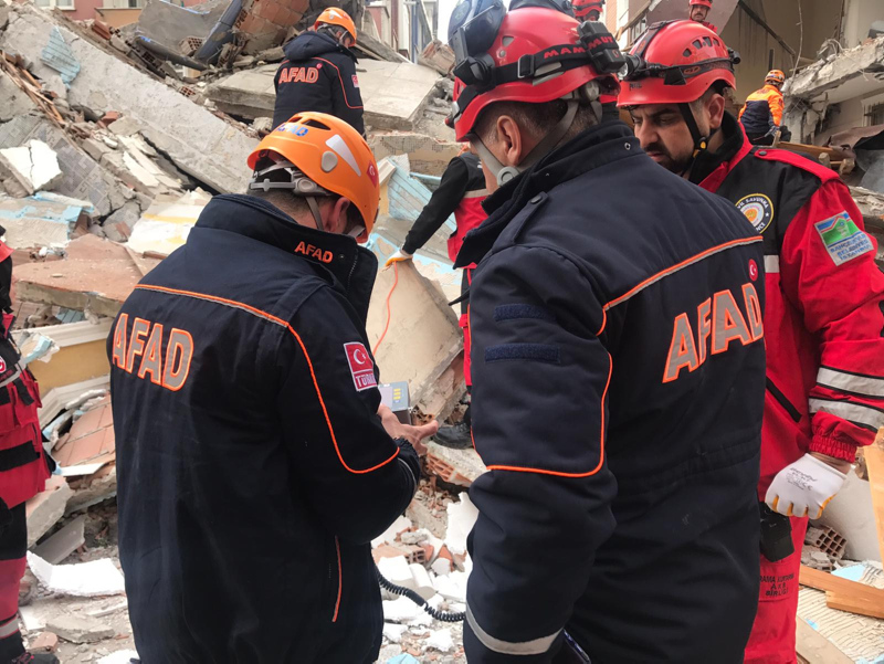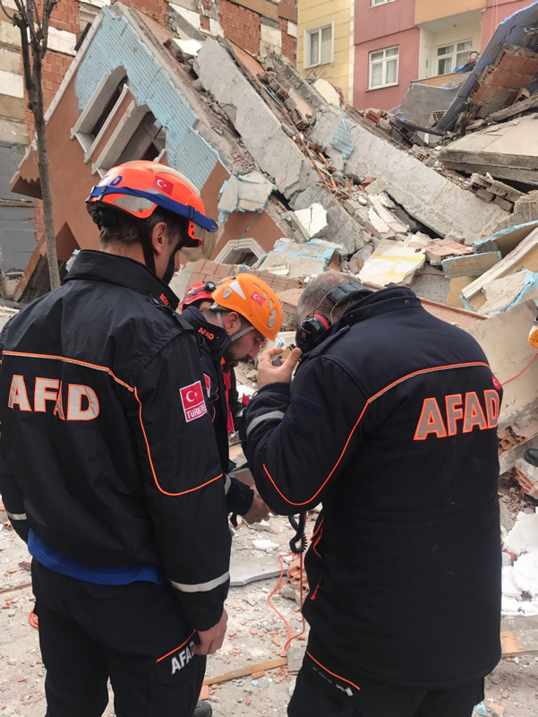 Arama kurtarma ekipleri, dinleme cihazı ve arama kurtarma köpeği ile enkazda çalışma yapıyor.