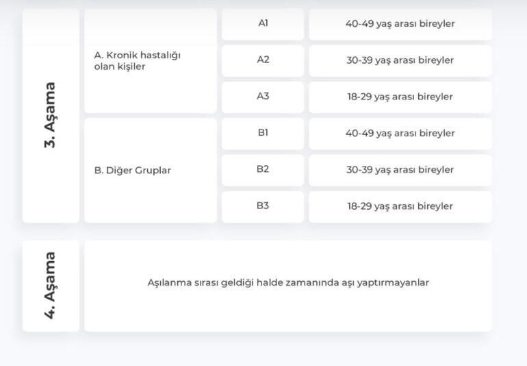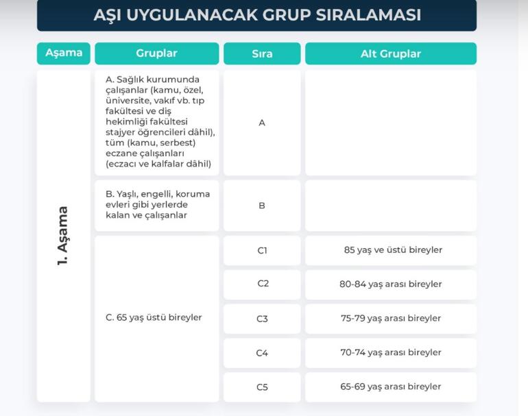 Aşılama süreci belirlenen gruplar dahilinde gerçekleştirilecek. Sağlık çalışanlarının aşılama sürecinin tamamlanmasının ardından diğer gruplar için aşılama takvimi ilerleyen günlerde açıklanacak. Tarihlerin belli olmasının ardından MHRS üzerinden randevu alınabilecek.