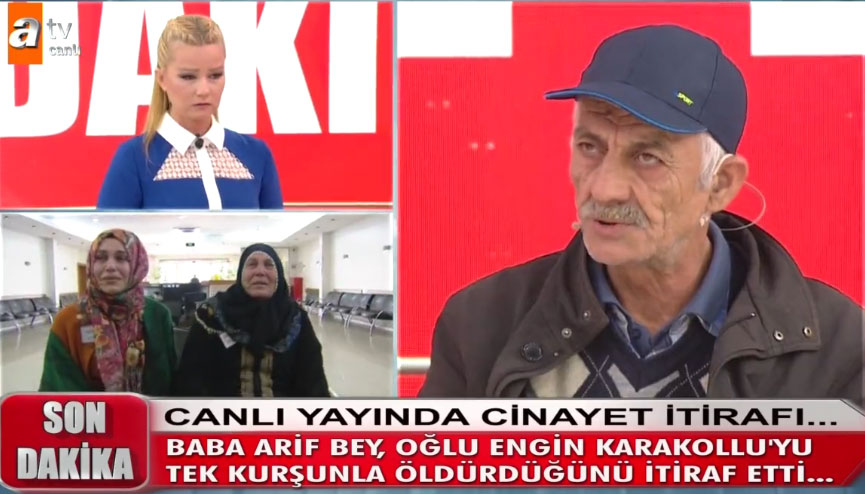 Müge Anlı canlı yayında zor anlar yaşadı. Hafta içi her gün atv kanalında ekranlara gelen Müge Anlı ile Tatlı Sert programında bugün kan donduran itiraf geldi. Annesi, kardeşi ve babasını döven,15 aydır kayıp olan Engin Karakollu'yu babası neden öldürdü? 9 Nisan Müge Anlı canlı yayınında gelen cinayet itirafı ile herkesi şoke etti! Baba Arif Karakollu, tüm detayları canlı yayında anlattı.