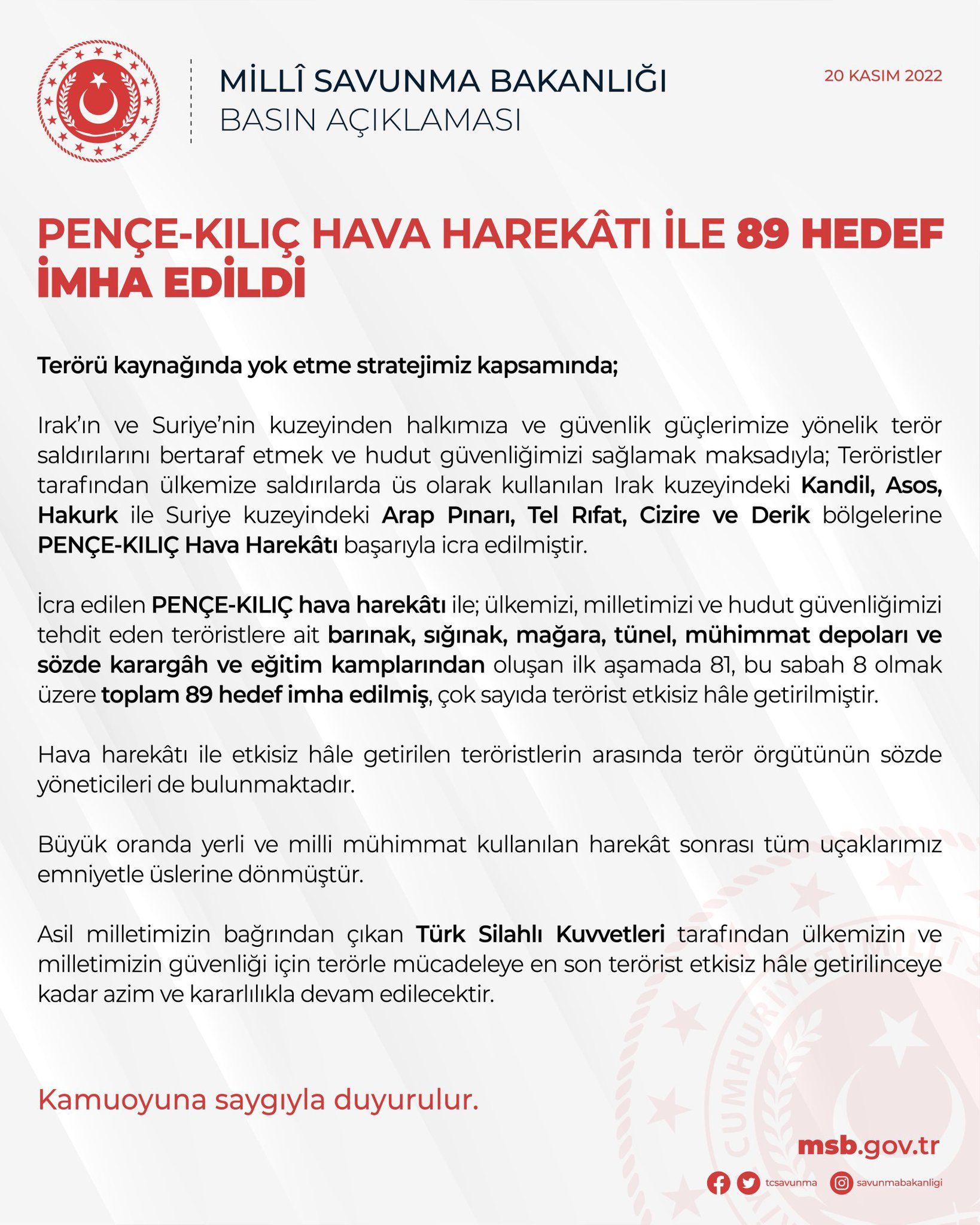 Son dakika... Türk Silahlı Kuvvetlerinin "Pençe-Kılıç Harekatı"nda muharip ve destek uçaklarının yanı sıra İHA/SİHA'lar ile 70'e yakın hava aracı görev aldı. Suriye'nin kuzeyindeki Aynularab ilk defa hava harekatıyla vurulurken, Türk Silahlı Kuvvetlerine ait uçaklar, eş zamanlı olarak Irak'ın kuzeyinde sınır hattına 140 kilometre mesafedeki Asos ile 90 kilometre mesafedeki Kandil'deki hedefleri imha etti. Öte yandan İstiklal Caddesi'ndeki saldırıda hayatını kaybeden 9 yaşındaki Ecrin ile 15 yaşındaki Yağmur'un isimlerinin askerler tarafından terör hedeflerini vuran bombaların üzerine yazılmasına ilişkin Milli Savunma Bakanlığı tarafından sosyal medyada paylaşılan fotoğraflar yoğun etkileşim aldı. Ayrıca hedef sayısındaki dikkati çeken detay da paylaşıldı...