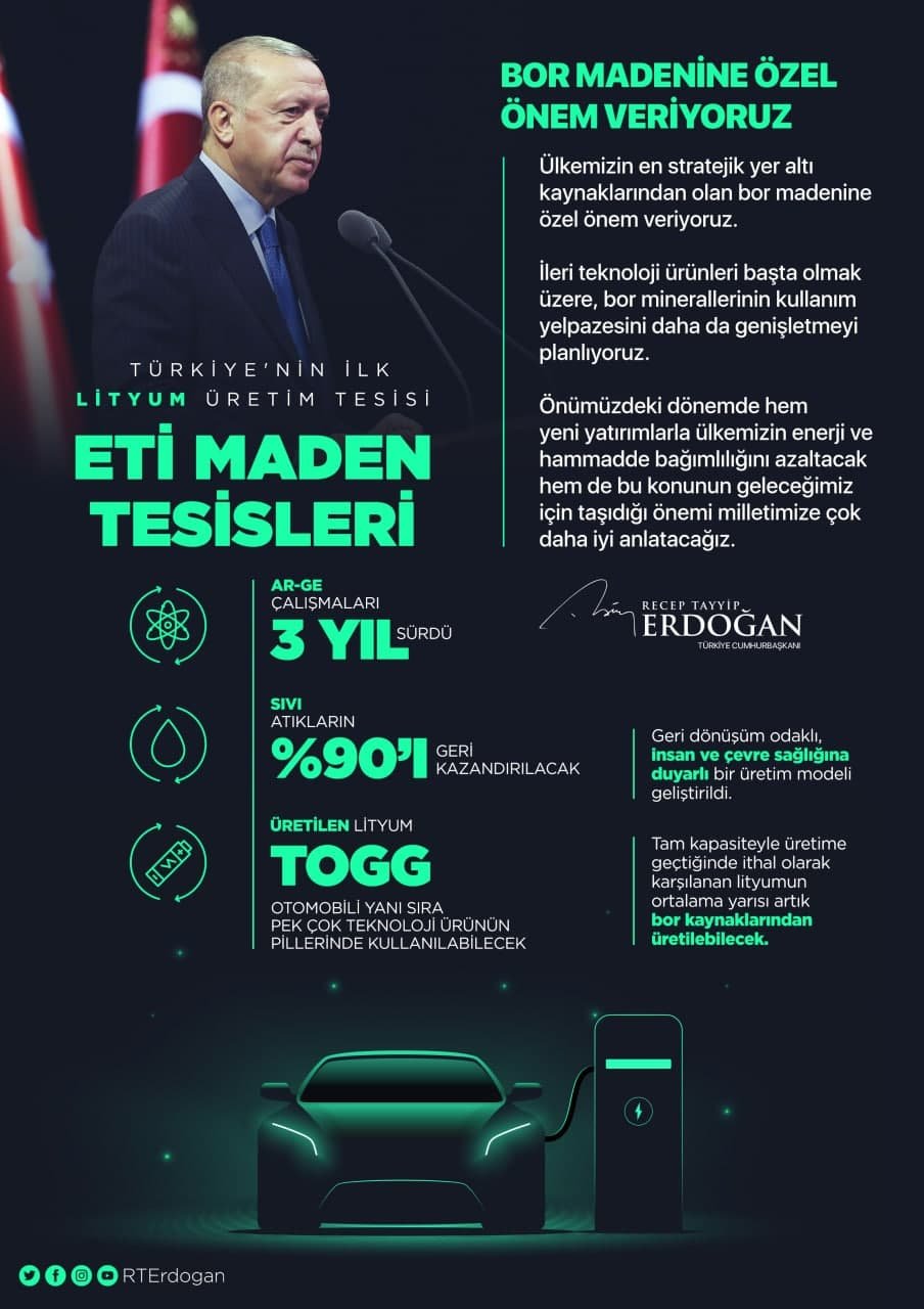 "Bor yatakları lityum da içeriyor. ETİ Maden atıklardaki bor ve lityum alınarak lityum karbonat üretimi gerçekleştirildi. Halihazırda tamamını ithal ettiğimiz lityum ihtiyacının yarıdan fazlasını karşılamış olacağız. "Projemiz TOGG otomobilinin pillerinde kullanılacak lityumu buradan temin etmeyi planlıyoruz. Akıllı telefon, tablet, dizüstü bilgisayarlarda bu lityum kullanılacaktır. Ayrıca tesisten temiz su temin edilecek."
