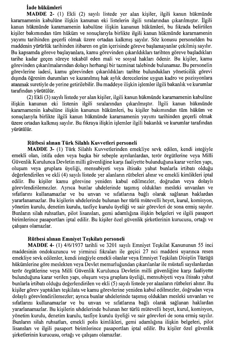 Kurumlarından daha önce ayrılan, TSK'dan 324, Emniyet Genel Müdürlüğünden 1167 ve jandarmadan 35 personelin rütbeleri 701 sayılı KHK ile alındı.