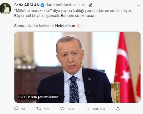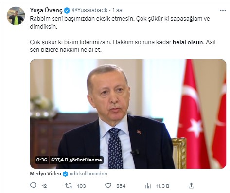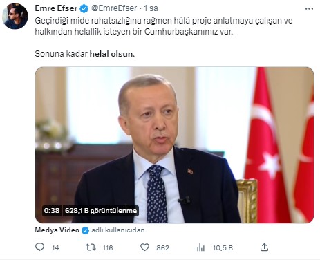 Başkan Recep Tayyip Erdoğan dün katıldığı canlı yayında ufak bir rahatsızlık geçirirken sonrasında yayın kaldığı yerden devam etti. Başkan Erdoğan yaptığı açıklamada "Bugün yoğun kampanya çalışmaları vardı midemi ciddi anlamda üşütmüşüm" ifadelerini kullandı. Başkan Erdoğan ayrıca "Sizlerden ve seyircilerimizden helallik diliyorum" diyerek vatandaşlardan helallik istedi. Başkan Erdoğan'ın bu sözleri sonrasında dün akşamdan beri #HelalOlsun ve #RecepTayyipErdoğan etiketi sosyal medyada gündem olurken vatandaşlardan Erdoğan'a destek mesajı yağdı. Ahaber.com.tr olarak vatandaşların bu destek mesajlarını sizler için derledik. İşte detaylar...
