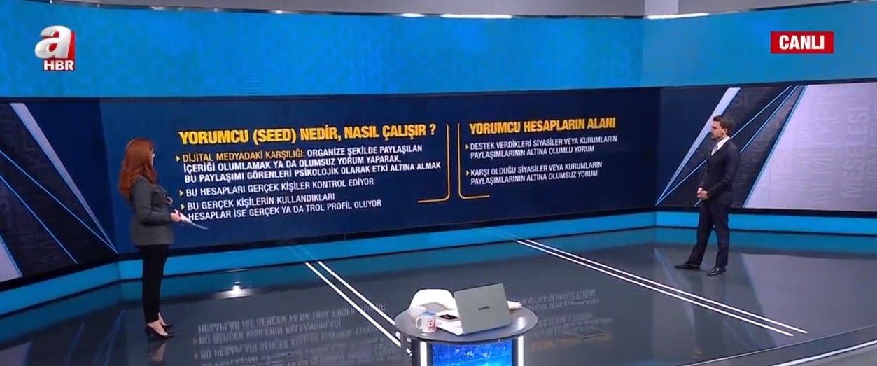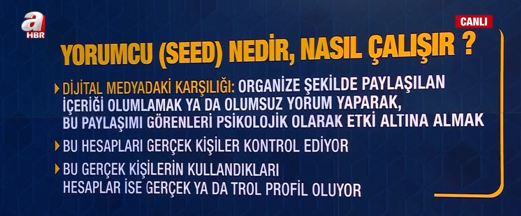 A Haber canlı yayınında sunum yapan Ömer Arvas, "Seed (yorum hesapları) bunlar ne kadar teknik terim olarak gözükse de hepimizin hayatına dokunan manipülasyon amaçlı yapılardır." dedi.