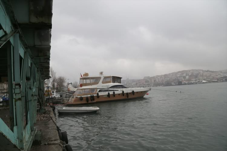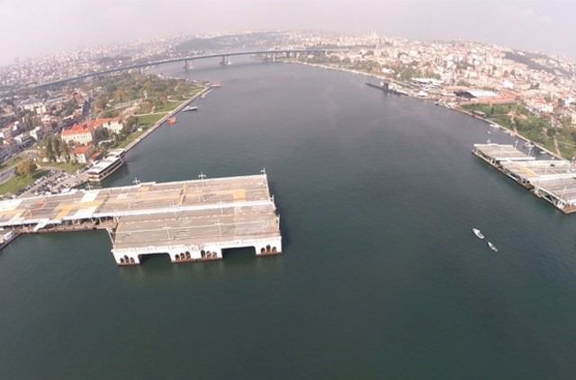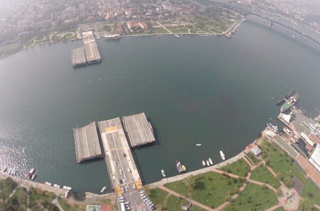 Haliç'teki su sirkülasyonu engellediği için ortada bulunan bölümü açılmış bir vaziyette yıllardır bekleyen eski Galata Köprüsü'nün yüzer dubaları römorkörlerle çekilerek Haliç'ten çıkarıldı.