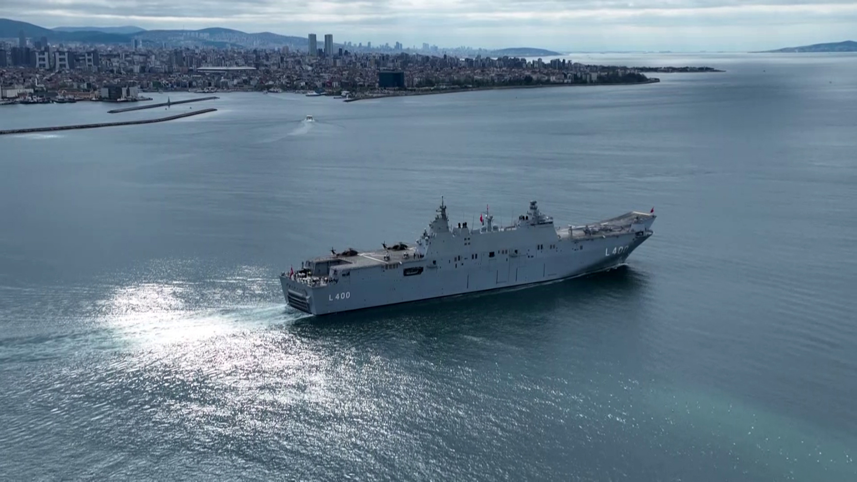 Sarayburnu'nda vatandaşların ziyaretine açılan dünyanın ilk SİHA gemisi TCG Anadolu, demir aldı. Dev gemi drone kamerası ile görüntülendi. MSB sosyal medya hesabından TCG Anadolu Gemisinin Sarayburnu'ndan hareket ettiği anlara ait görüntüleri paylaştı. İlk seferine çıkan gemi Başkan Recep Tayyip Erdoğan ve vatandaşları selamladı.
