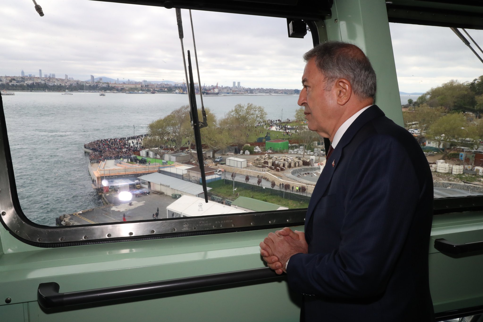 Deniz Kuvvetleri Komutanlığının yeni amiral gemisi TCG Anadolu'nun köprü üstüne çıkan Akar, burada seyir subayından yapılacak Boğaz geçişine ilişkin bilgi aldı.