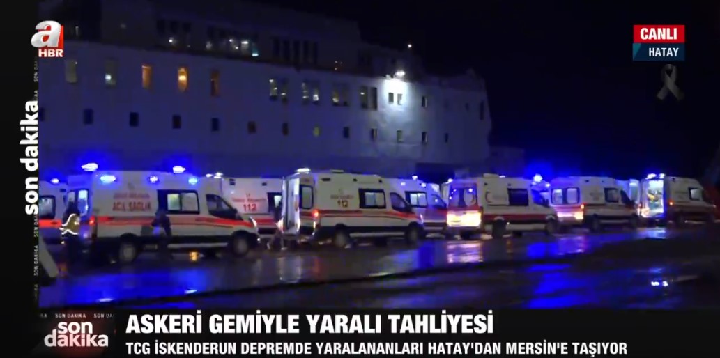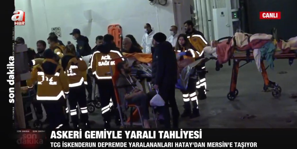 TCG İskenderun gemisi, yaralıları Mersin'e ulaştırmak için Hatay İskenderun Limanı'na geldi. Milli Savunma Bakanı Hulusi Akar, "Bölgedeki yaralılarımızın hastanelerdeki hasardan dolayı burada bakımlarının mümkün olmayacağını düşünerek bizim TCG İskenderun gemisini görevlendirmek suretiyle, bu gece İskenderun Limanı'na yanaşacak. Ve buradaki bütün yaralıların en kısa zamanda Mersin'deki daha donanımlı hastaneye sevkini mümkün kılacağız." açıklamasında bulunmuştu.