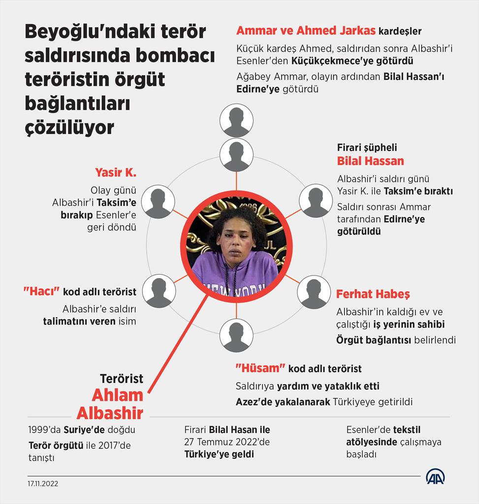Beyoğlu İstiklal Caddesi üzerinde geçen pazar günü, Suriye uyruklu terörist Ahlam Albashır, bombalı saldırı gerçekleştirdi. Patlamada 6 kişi hayatını kaybederken 81 kişi ise yaralandı. Olayın ardından Albashır'la birlikte 51 kişi gözaltına alındı.