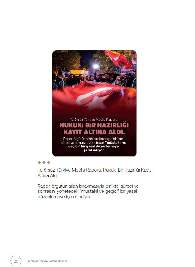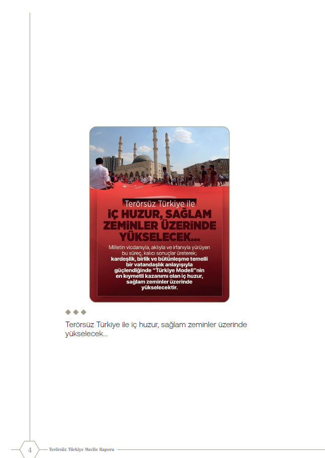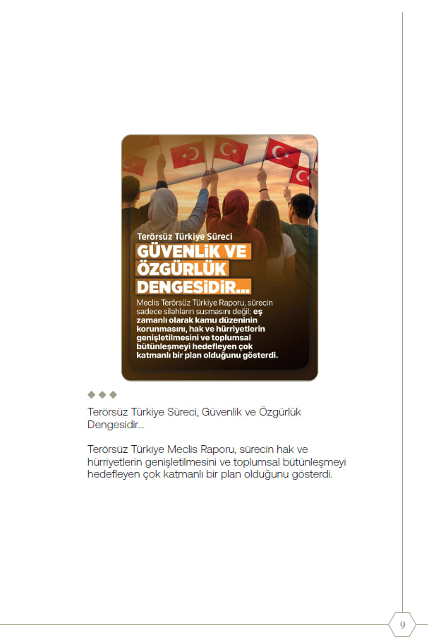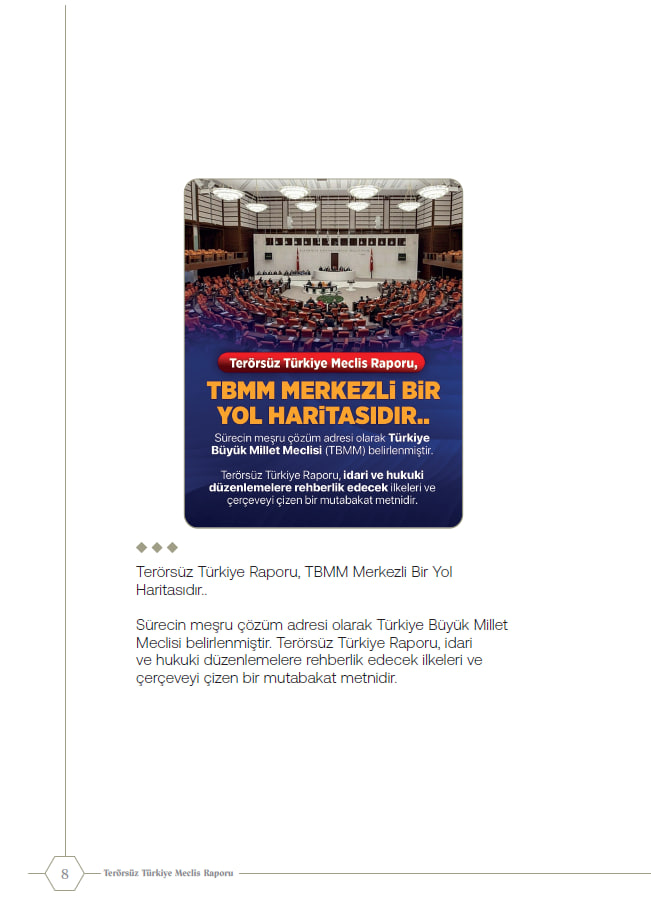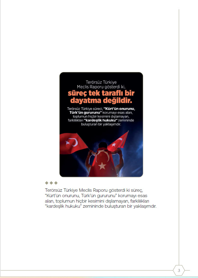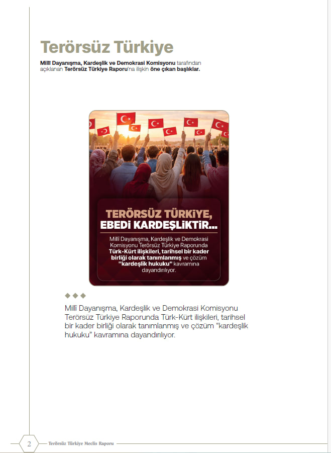 Raporda; Türk-Kürt ilişkileri "tarihsel kader birliği" olarak tanımlanırken çözümün "kardeşlik hukuku" temelinde ele alındığı vurgulandı. Sürecin yalnızca güvenlik eksenli olmadığı; sosyolojik, ekonomik ve psikolojik boyutları kapsayan bütüncül bir "Türkiye Modeli" olduğu kaydedildi.